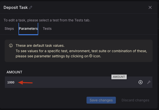 - Tasks: Each parameter has a default value, typically set when the task is created. If no other overrides are applied, this default value is used in any test that includes the task.