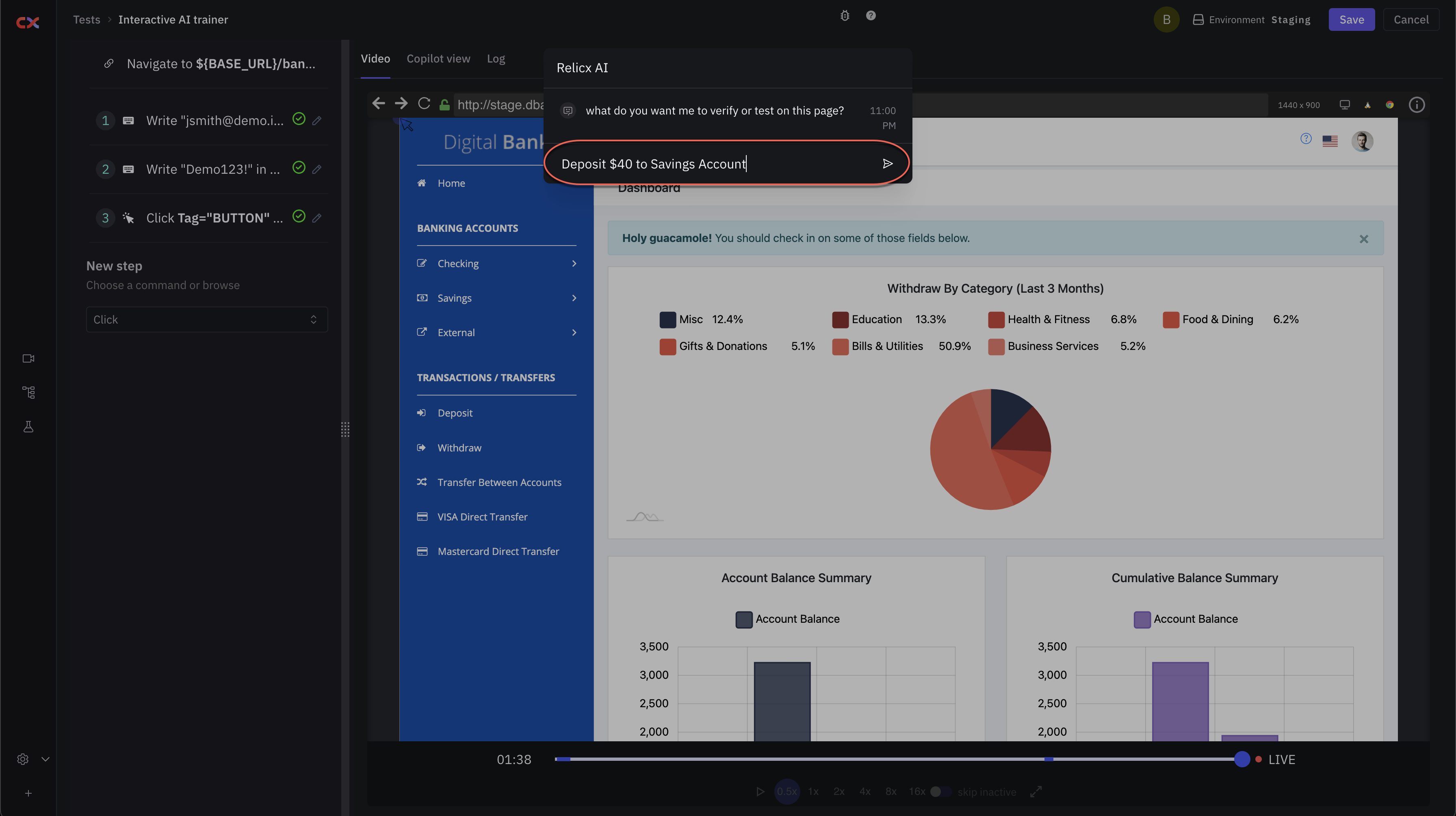 Here we simply instruct Harness AI to perform a specific task and it figures out the required steps. Here in the example below we have asked Copilot to deposit $40 to the savings account