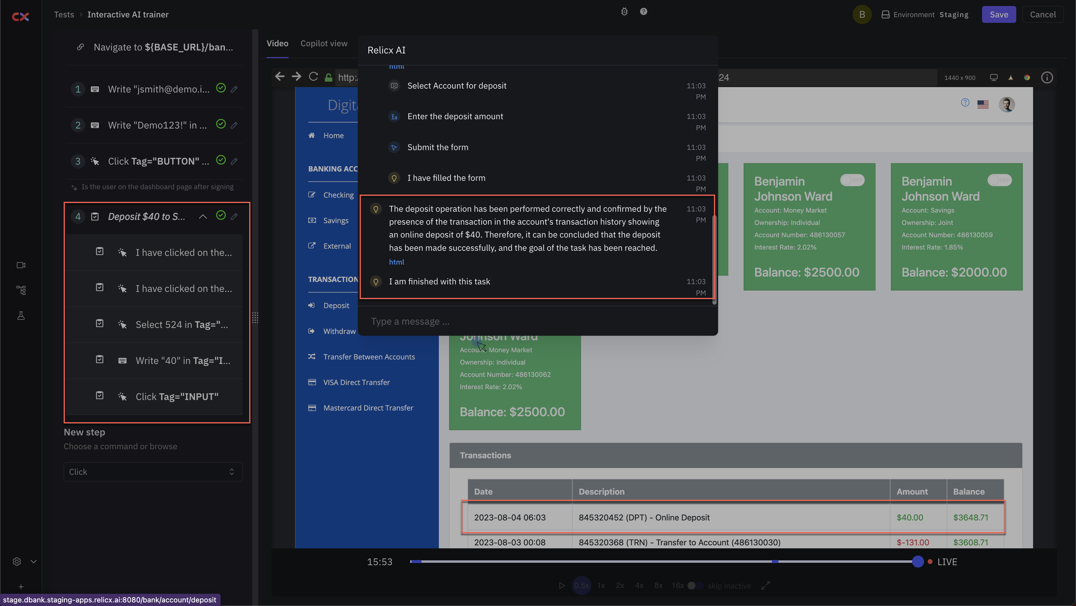 Here we see the steps on the left that Copilot had recorded to perform the task assigned "Deposit $40 to savings account"