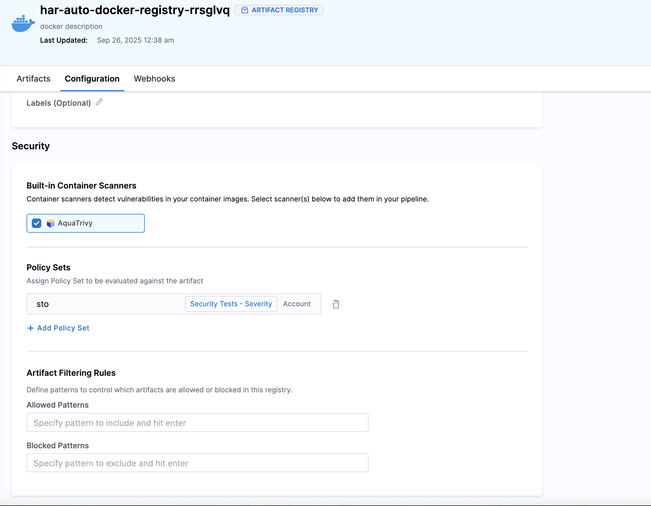When the Harness Supply Chain Security module is enabled, artifacts in the Harness Artifact Registry are automatically scanned using AquaTrivy, the currently supported scanner. Built-in container scanning creates a pipeline to ensure every artifact is scanned upon entry. Additional scanner options will be introduced in the future.