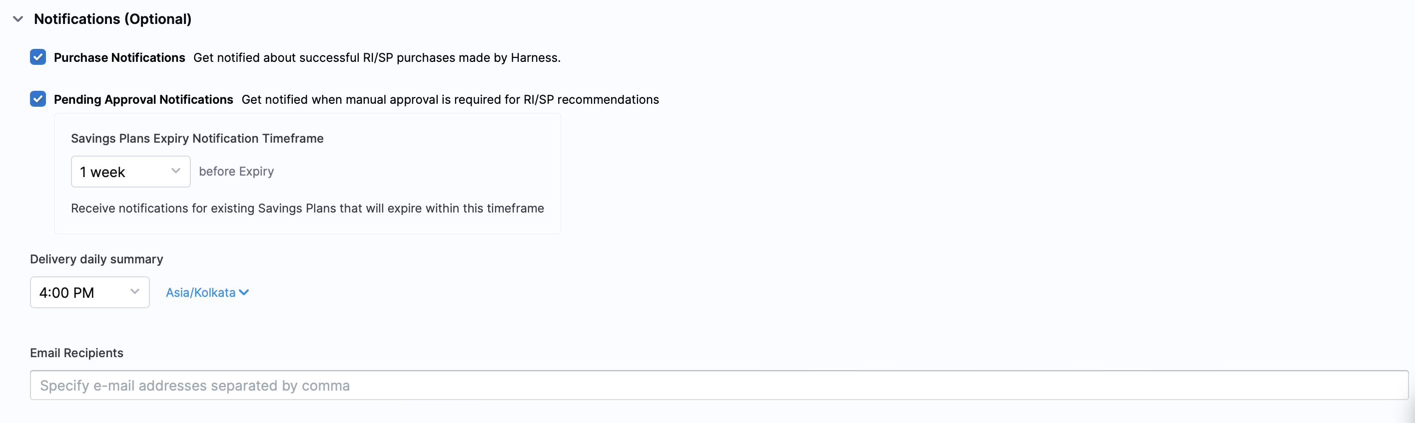 Savings Plans Expiry Notifications: Set a timeframe (up to 7 days before expiry) to receive alerts about your existing Savings Plans that will soon expire. This gives you adequate time to plan for renewals or replacement commitments.