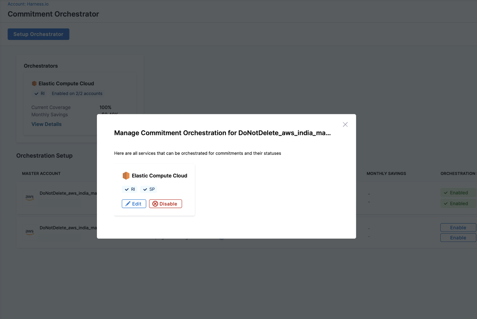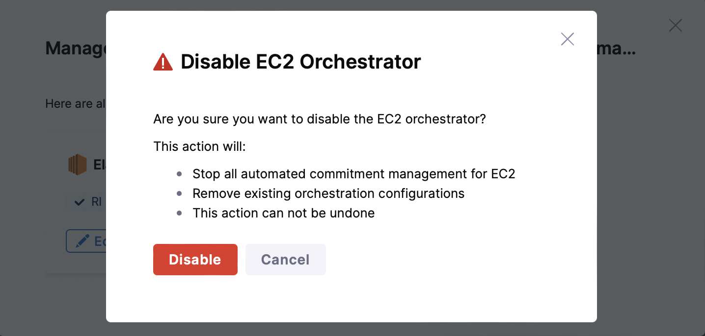 To disable a Commitment Orchestrator, navigate to Cloud Cost Management > Commitment > Orchestration Setup. Click on the three ellipses for the orchestrator you want to disable > Manage Orchestration Setup > Disable.