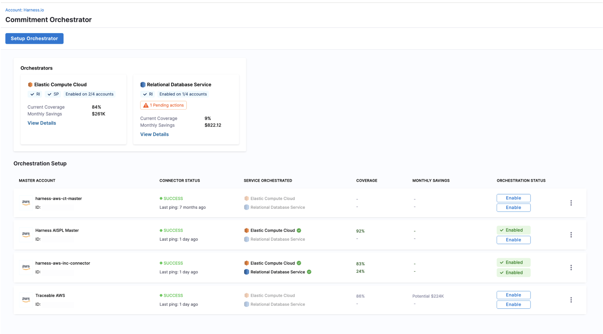 The Orchestration Setup page displays a comprehensive list of all Master Accounts with Commitment Orchestrator connector permissions. From this page, users can enable new orchestration setups and view key metrics including Last 30 Days Coverage, Savings, and the current status of each Orchestrator configuration.