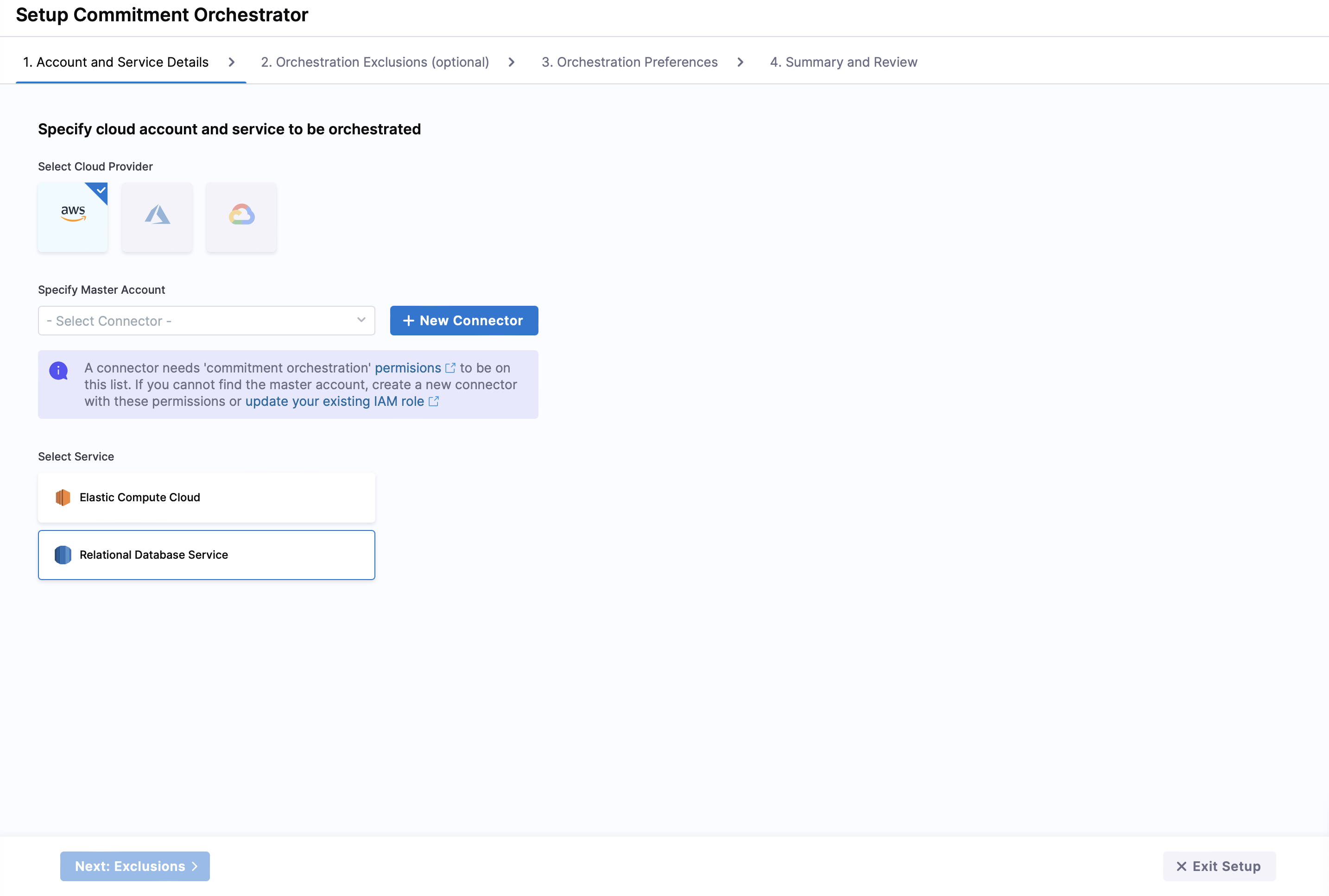 Specify the cloud account and service (RDS) for which you want to enable orchestration. Currently, Commitment Orchestrator supports AWS Elastic Compute Cloud (EC2) and AWS Relational Database Service (RDS). Support for other cloud providers is in the works.