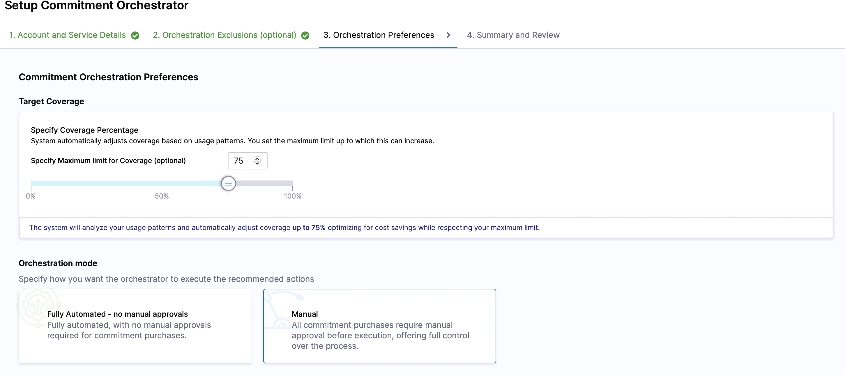 Orchestration Mode: Select how the orchestrator executes recommended commitment purchases:
