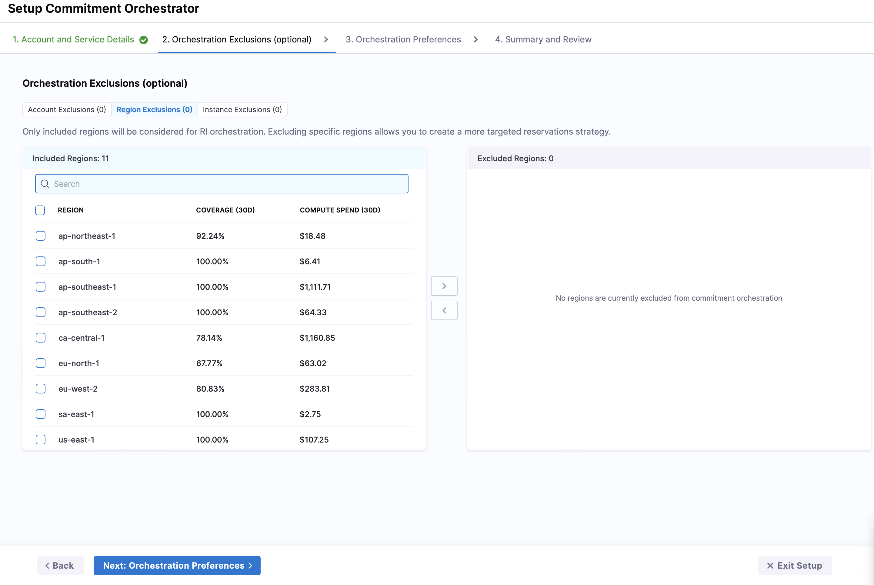 Region Exclusions: You can include or exclude specific regions from the orchestration. All the regions are shown with their coverage and compute spend for making an informed decision