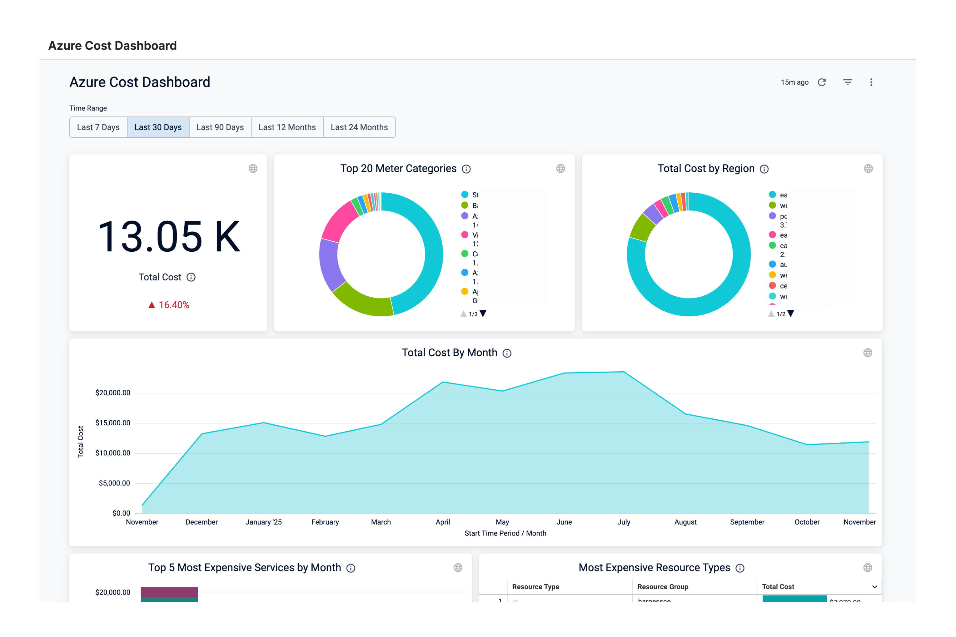 | Most Expensive Service by Month | The monthly cost of the most expensive Azure services, for example, Virtual Machines, Azure App Service, Azure DNS, etc. |
