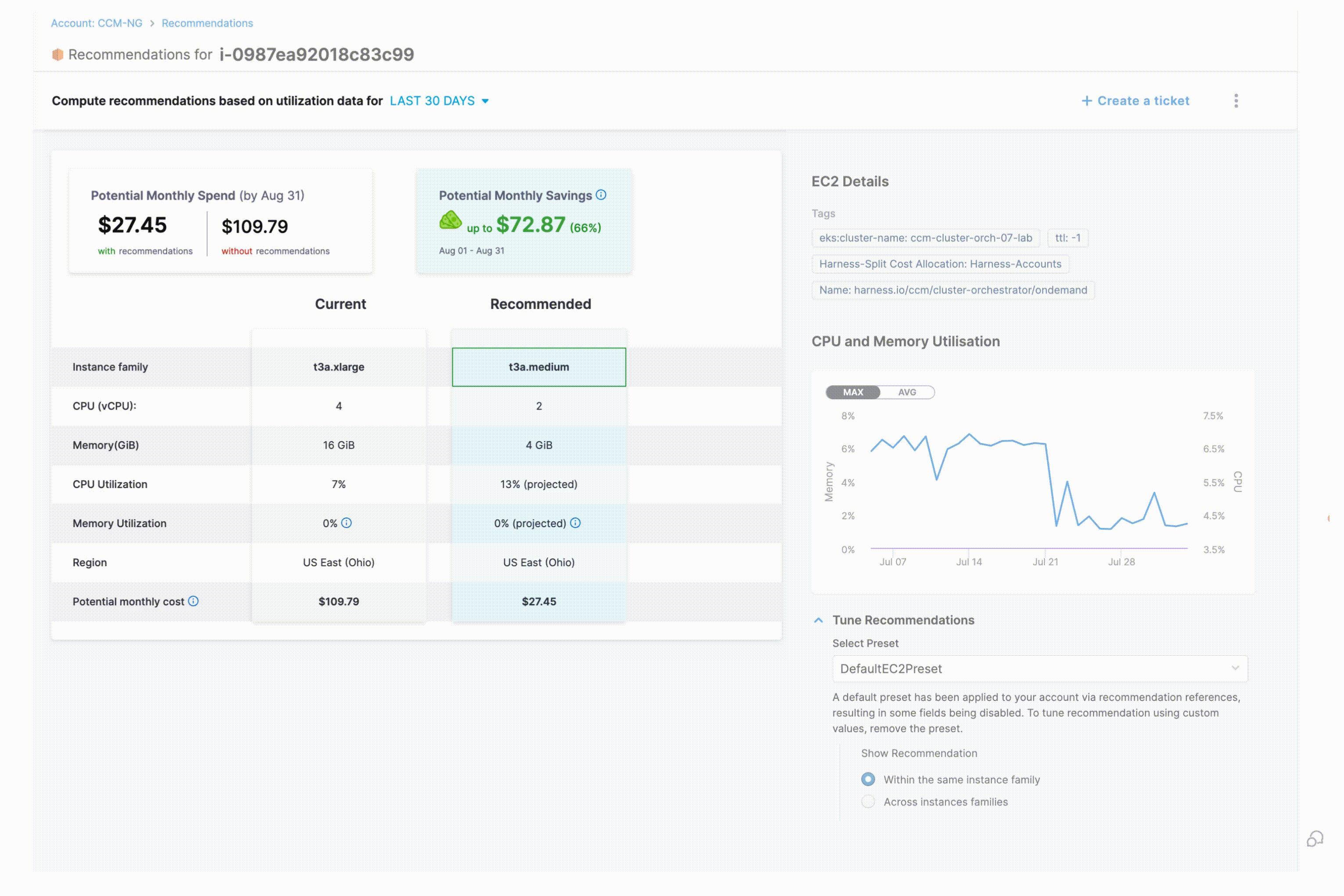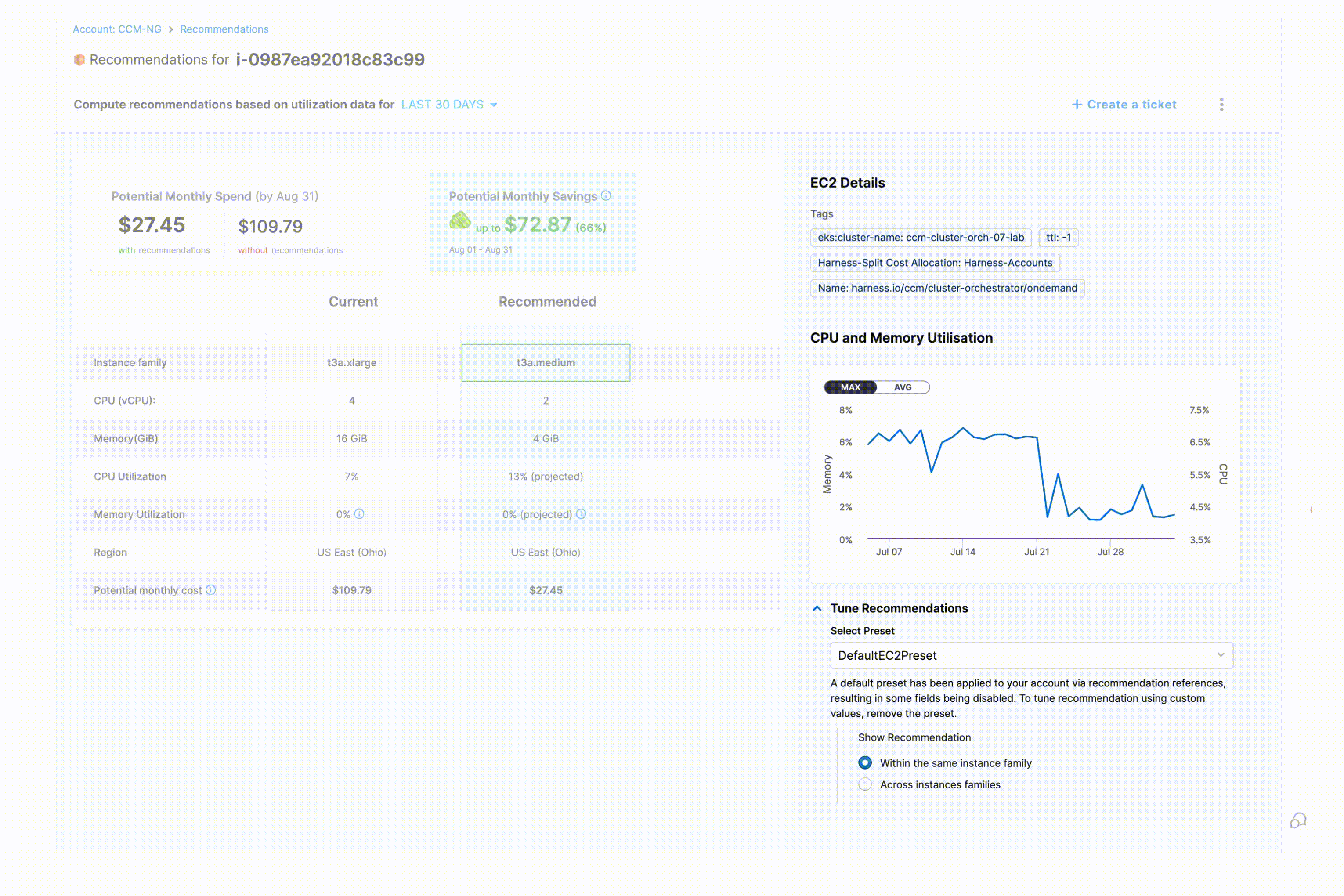 Harness CCM provides EC2 recommendations by integrating directly with AWS services: