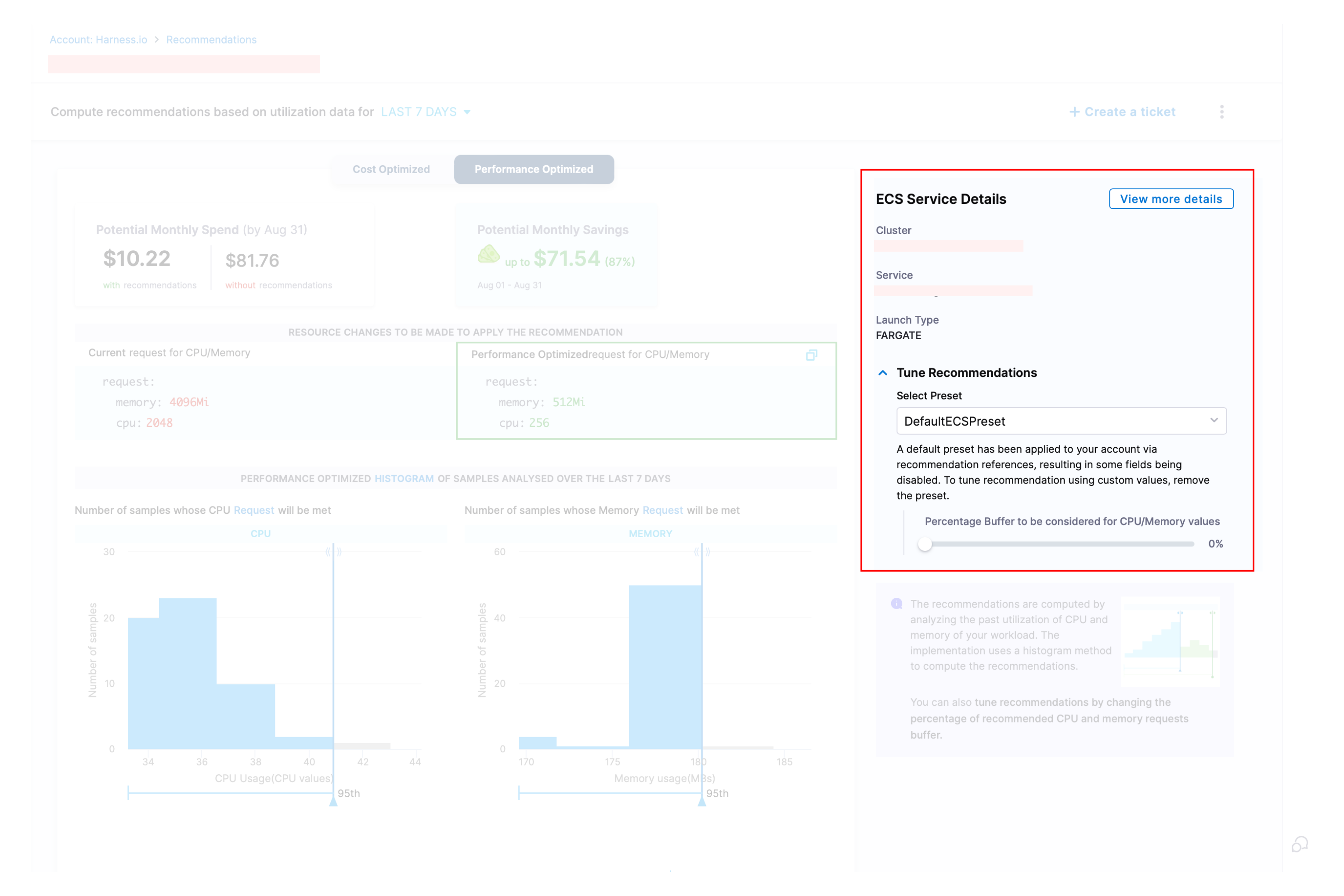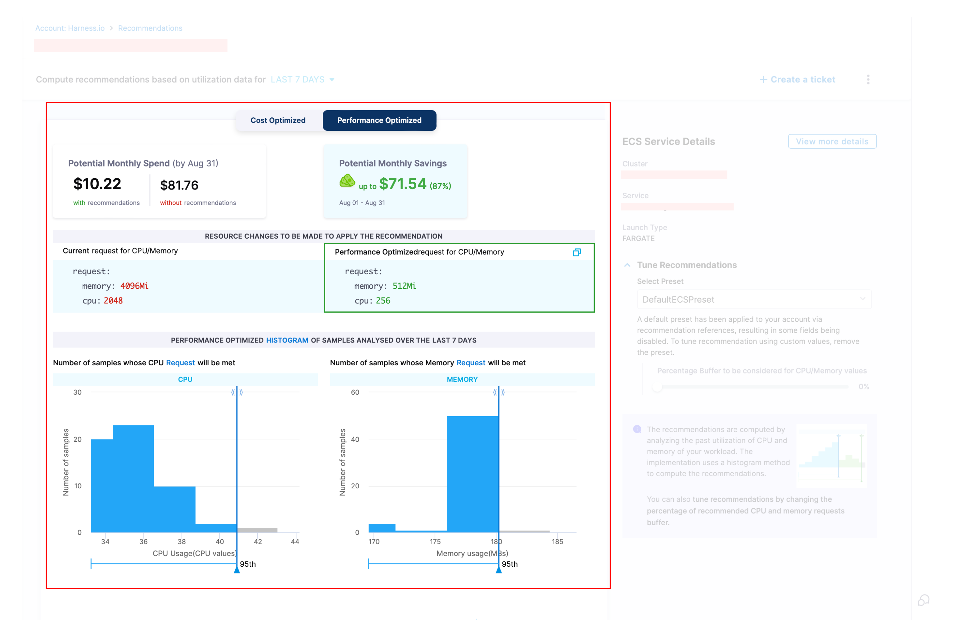 - Potential Monthly Spend: Projected cost if the recommendation is applied to your ECS service