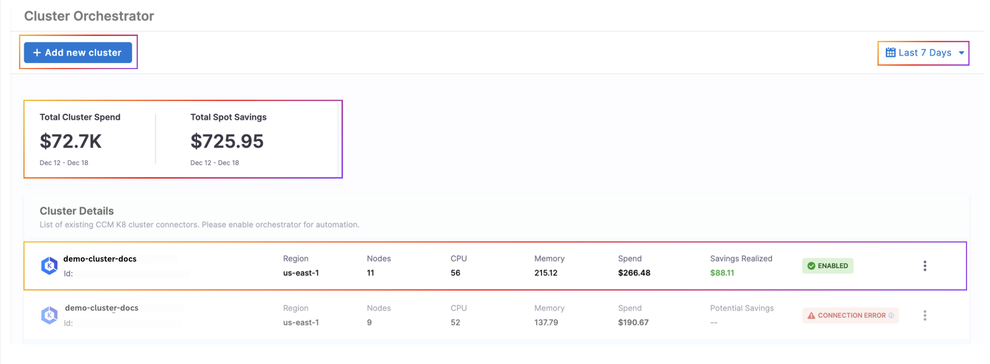 - Spend: The cost associated with this specific cluster during the selected time period