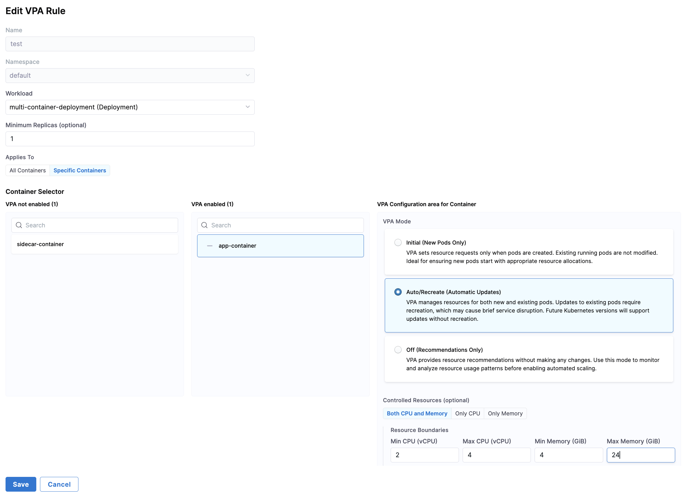 - Resource Boundaries: Min/max CPU and memory limits configured for the rule