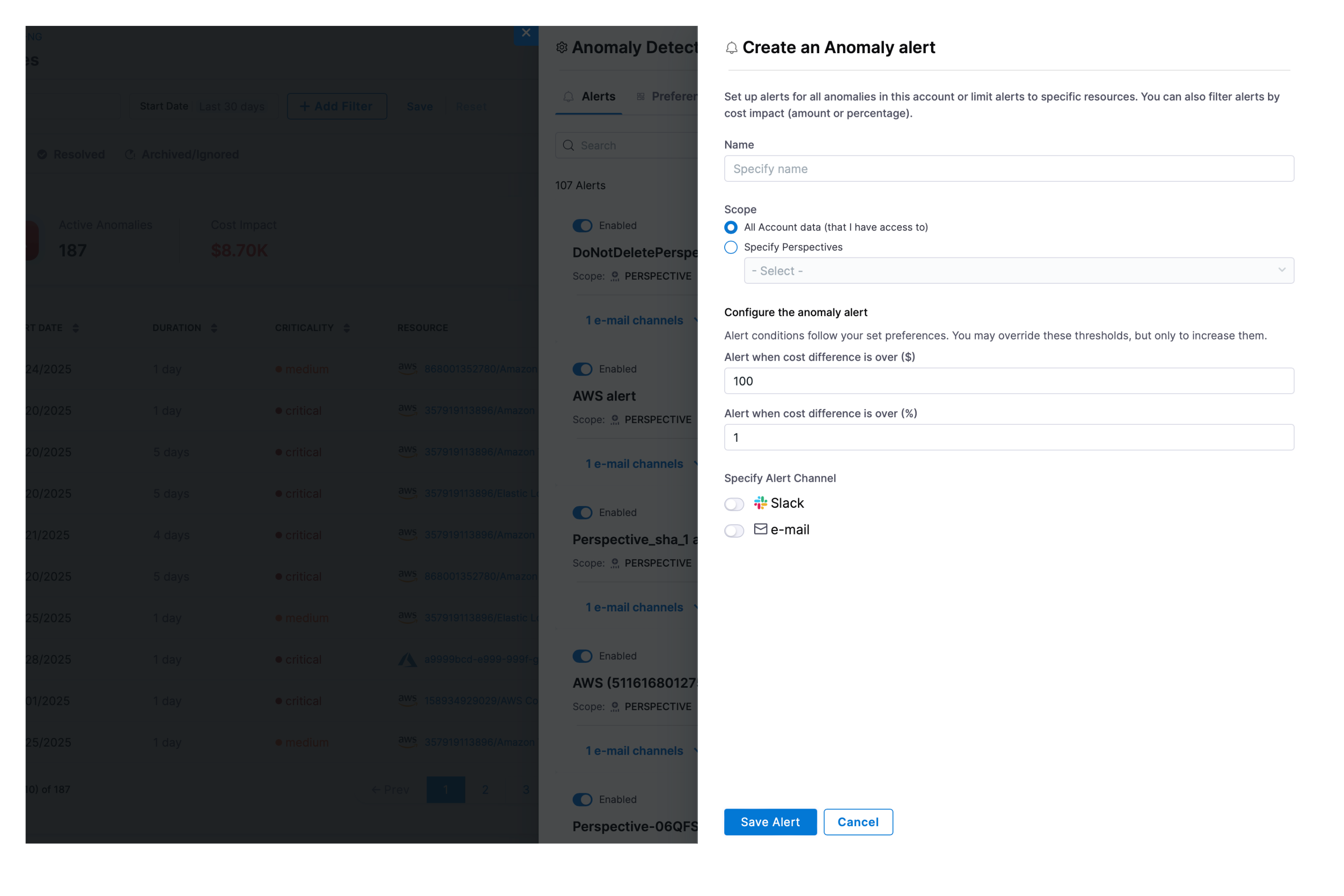 • Configure the anomaly alert: Alert conditions follow your set preferences. You may override these thresholds, but only to increase them. Currently, the user can set thresholds for “Alert when cost difference is over ($)” and/or “Alert when cost difference is over (%)” depending on whether they want to define a specific cost amount or a cost percentage.