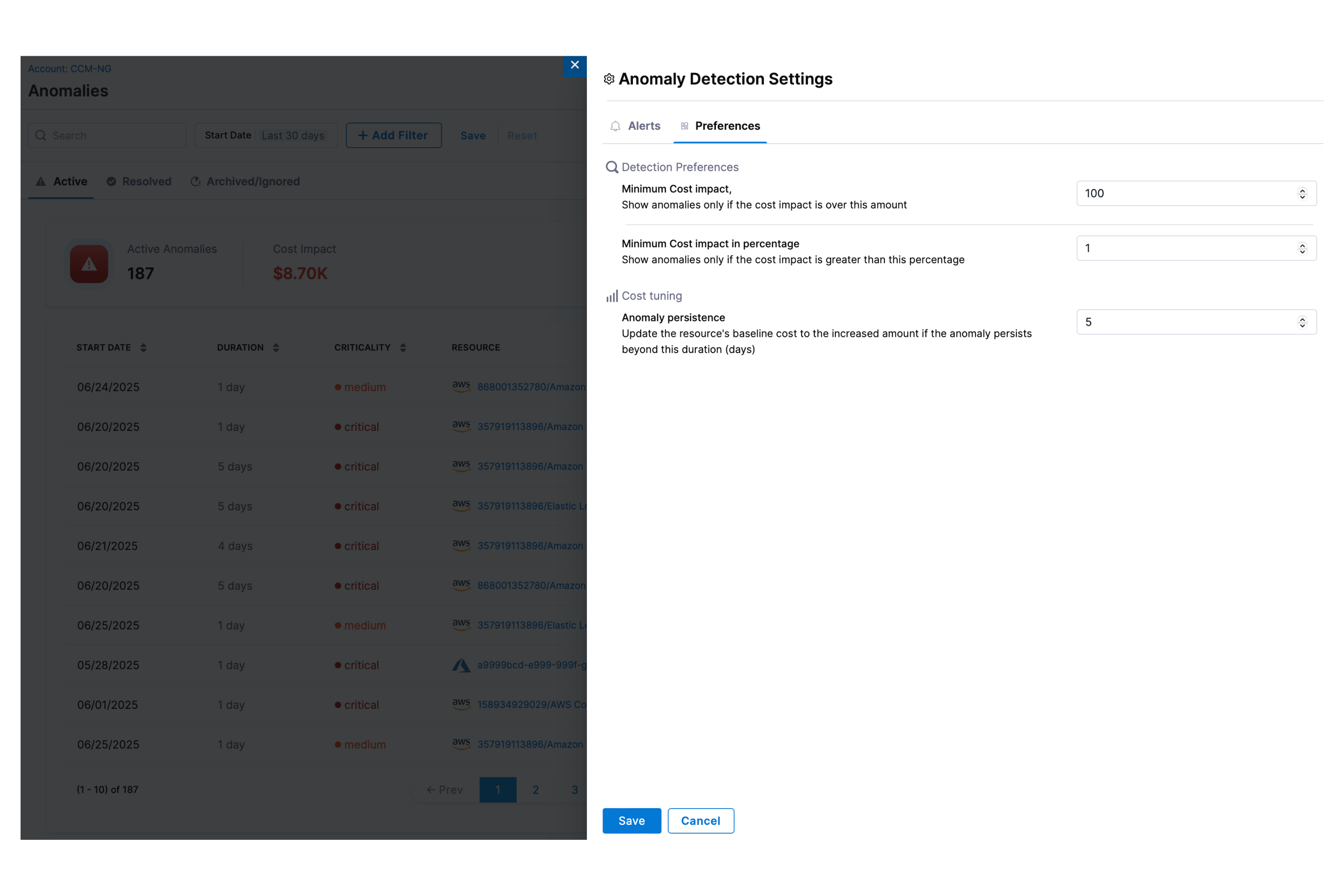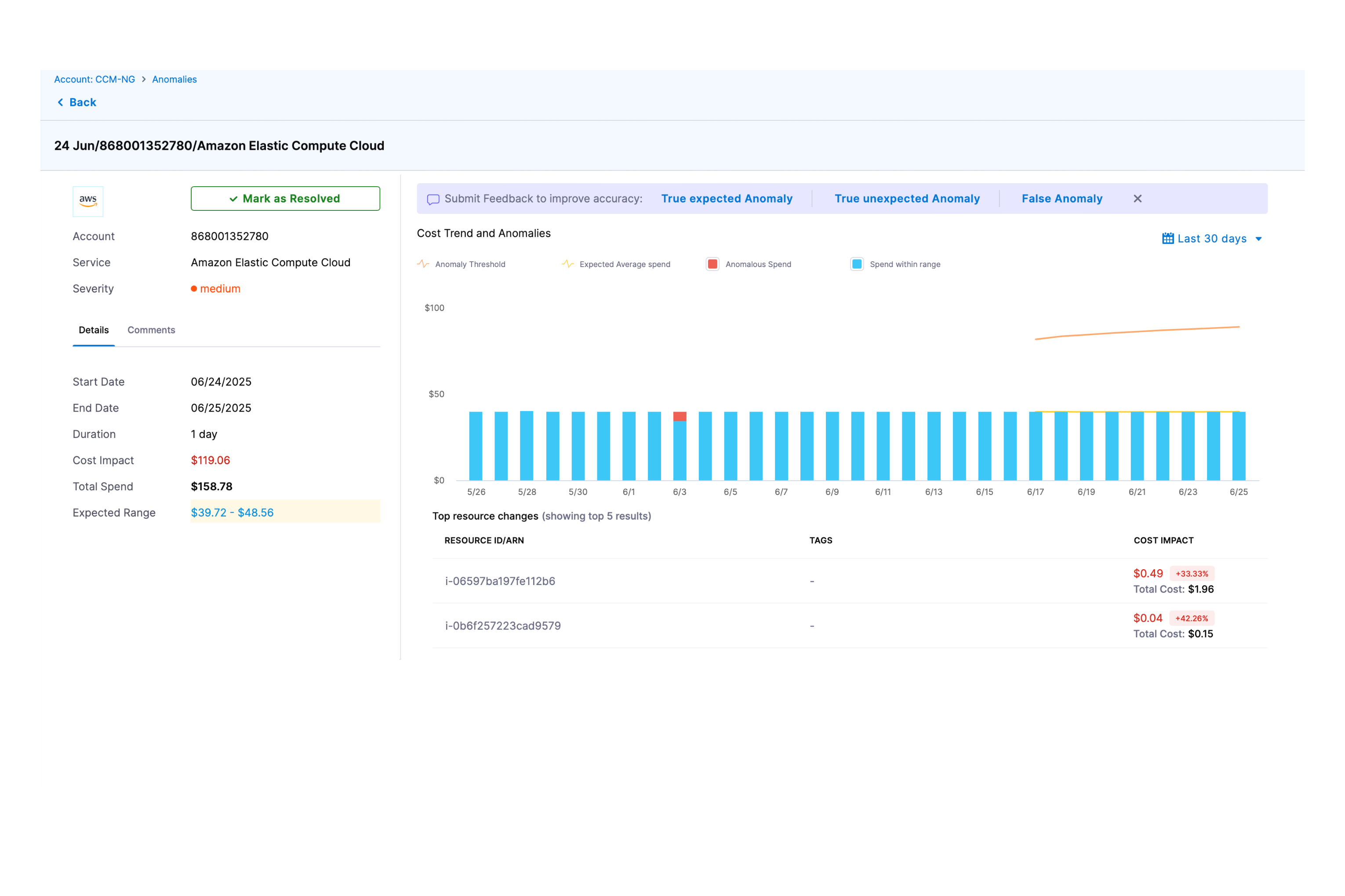 CCM also offers an advanced feature under a feature flag for AWS, GCP, and Azure that enables real-time anomaly detection: