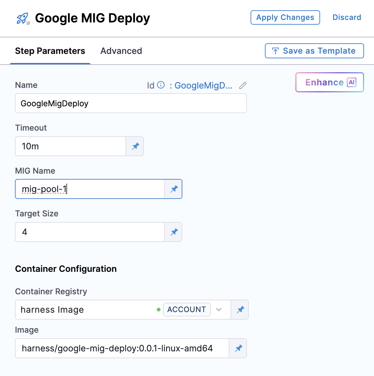 | Image | The deployment plugin container image. Use the official Harness image: harness/google-mig-deploy:0.0.1-linux-amd64 |