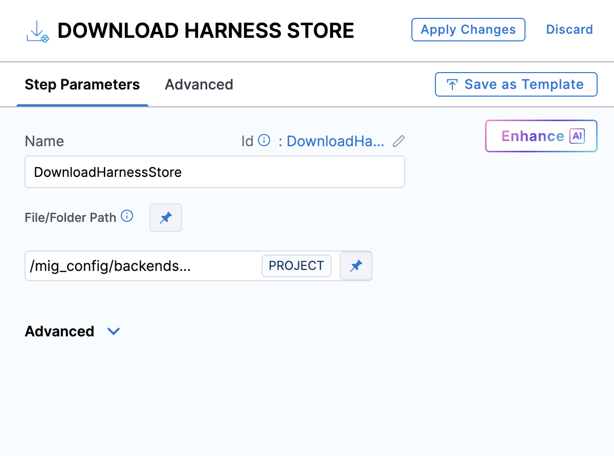 - Download Harness Store: Fetches the backend service configuration JSON file from the Harness File Store and makes it available for the next step. When configuring this step, specify the Download Directory Path (e.g.,