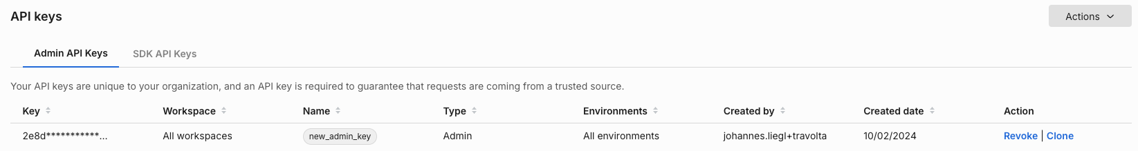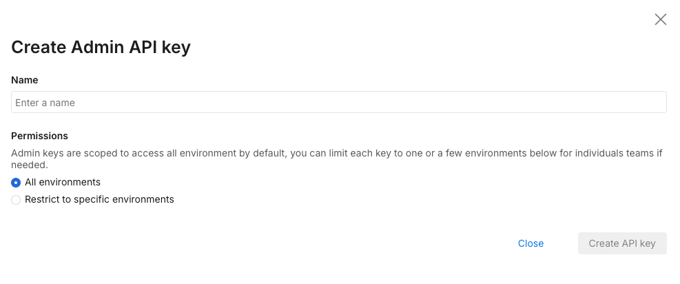 Select Admin as this tutorial’s API key needs to be for the Admin API. Give it a name and optionally restrict it to environments and projects that you are using the API key for.