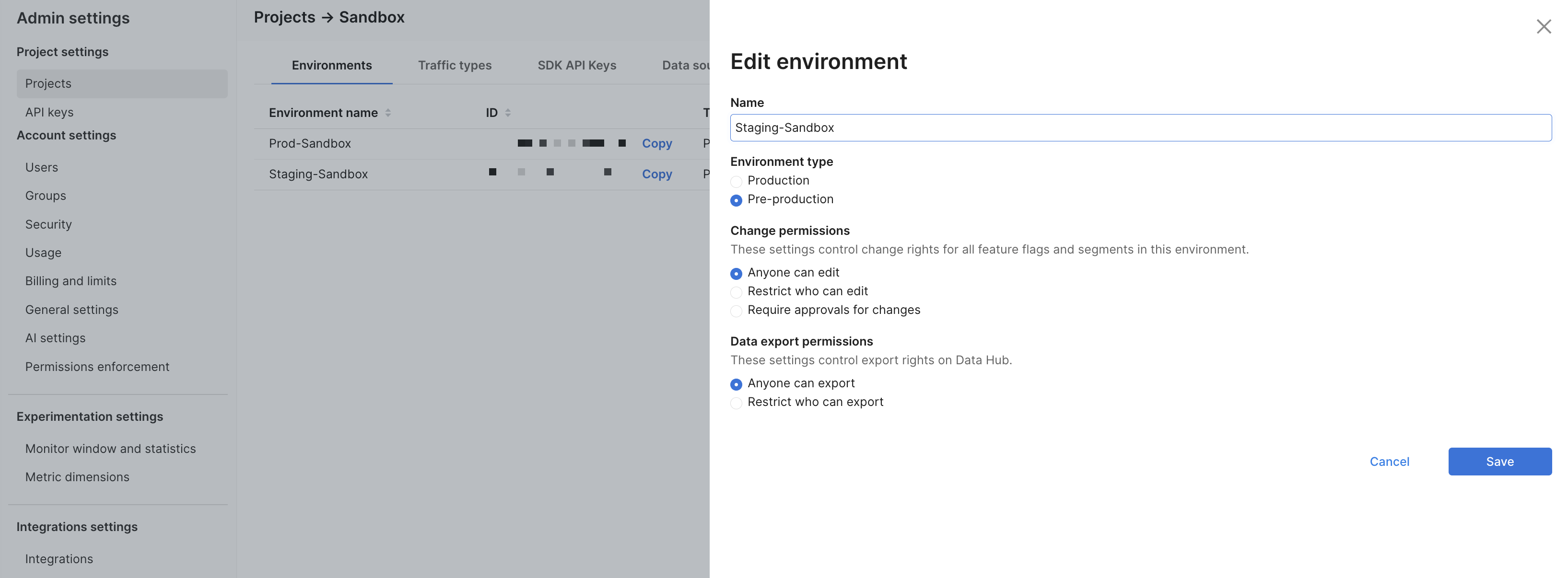 - It's common, and often critical, to have environment-level permission controls enabled for production environment(s). New, inexperienced teammates may accidentally edit a feature flag or make a rollout change they did not have the authority to make. For any pre-production environments, permission controls are not as important given the lack of customer impact and the robust auditing capability.