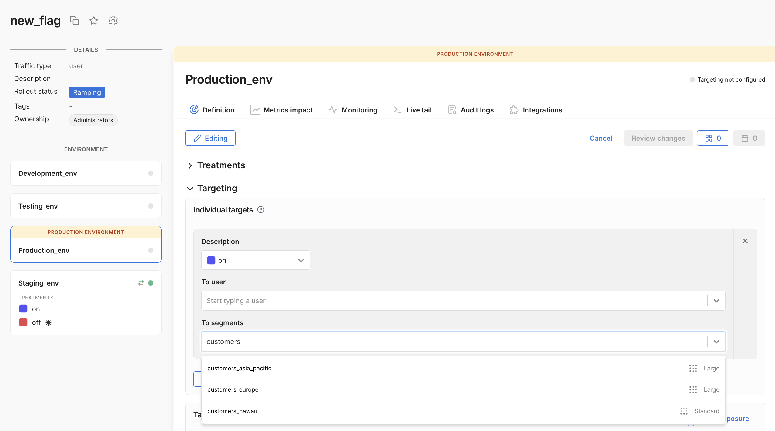 You can target segments in individual targeting rules. These rules assign a treatment to the segment. In the following example, the feature flag will serve on to all user IDs in the given segments.