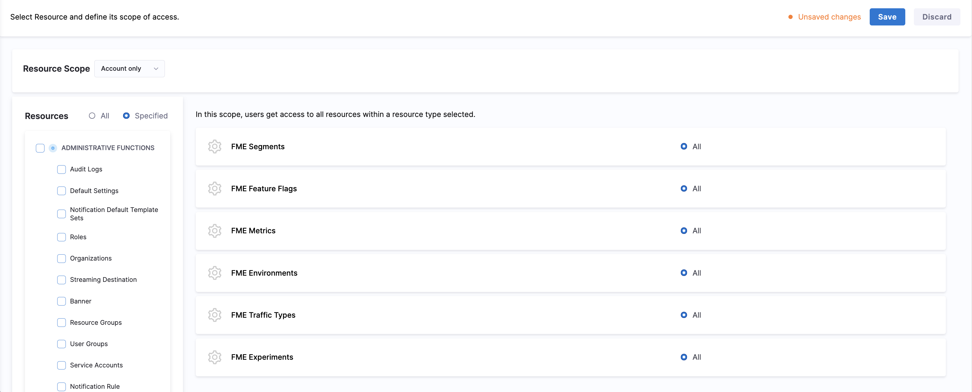 If you are a Harness FME administrator, you can use Resource Groups to control access to FME resources by specific environment and create custom roles to support granular permissions.