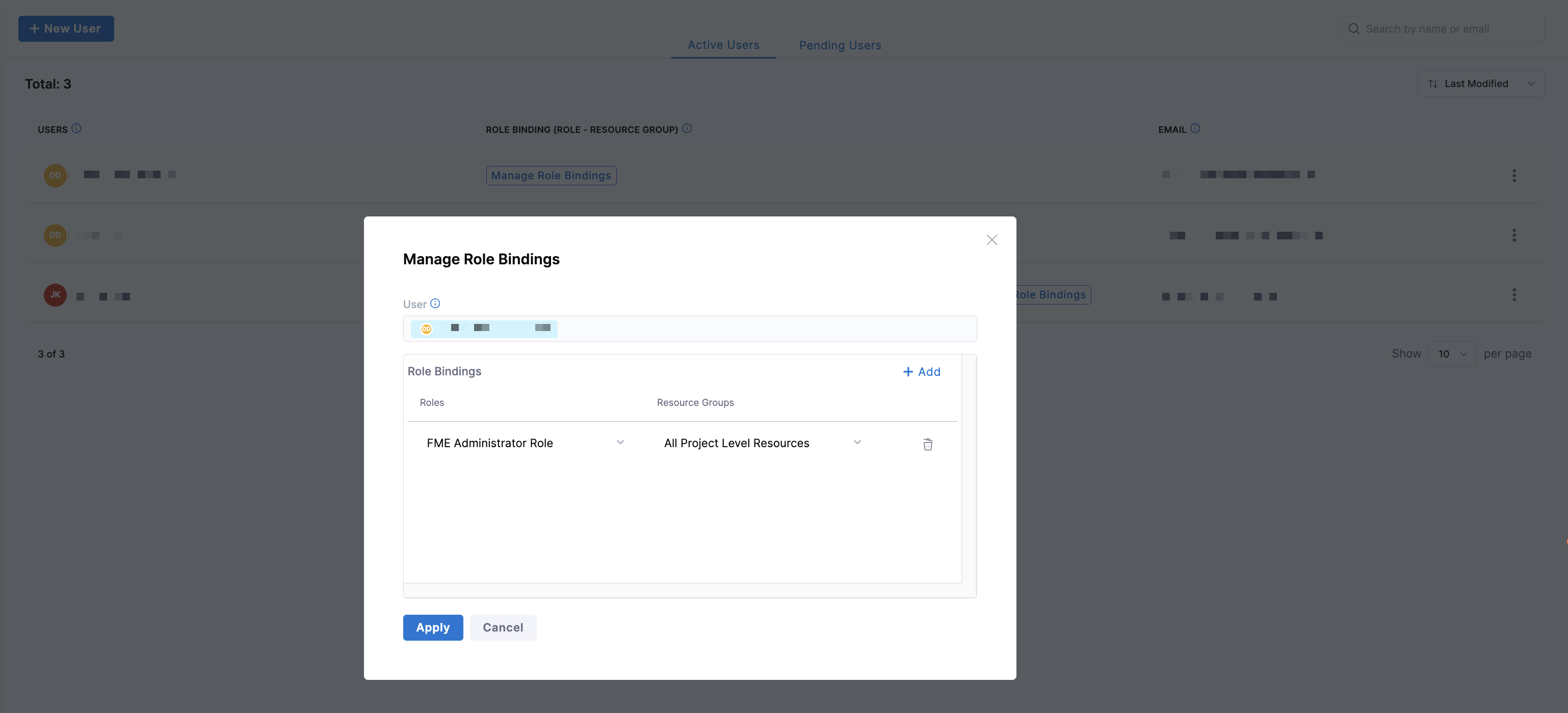 Apply the role to users or user groups by clicking Manage Role Bindings on the Users or User Groups page in Project Settings.