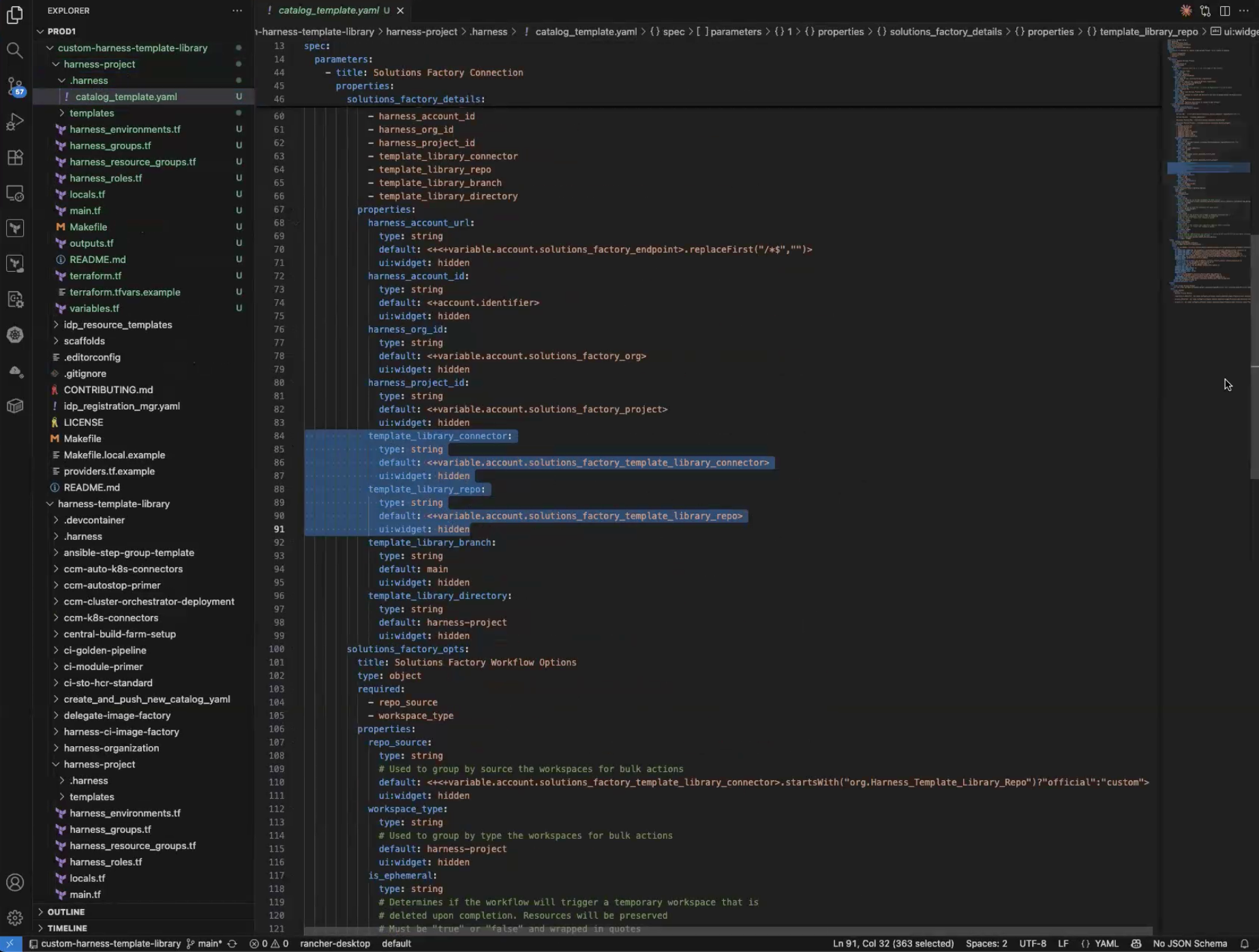harness-projecttemplate - open the fileharness-project/.harness/catalog_template.yamlin VSCodenoteThere are account level variables that manage the configuration of the Custom Template Library Connector and Repositories. You can access these variables and adjust them by updating the variable in the Account Settings for the platform.