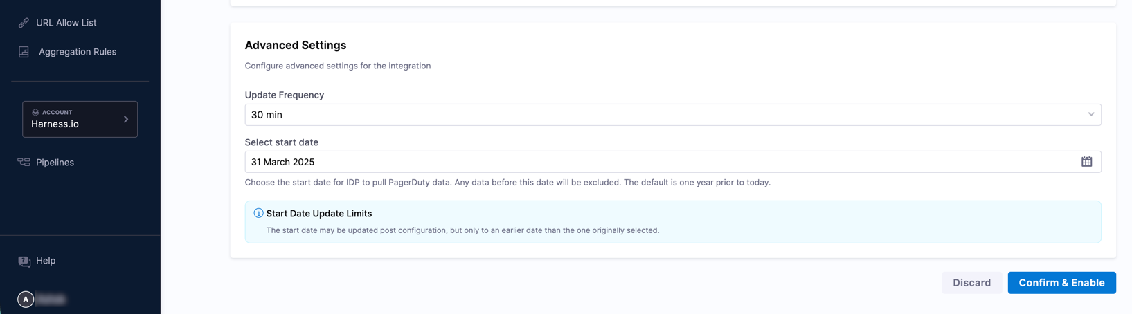 Start Date Update LimitsThe start date may be updated after the integration is configured, but only to an earlier date than the one originally selected. It cannot be moved forward.