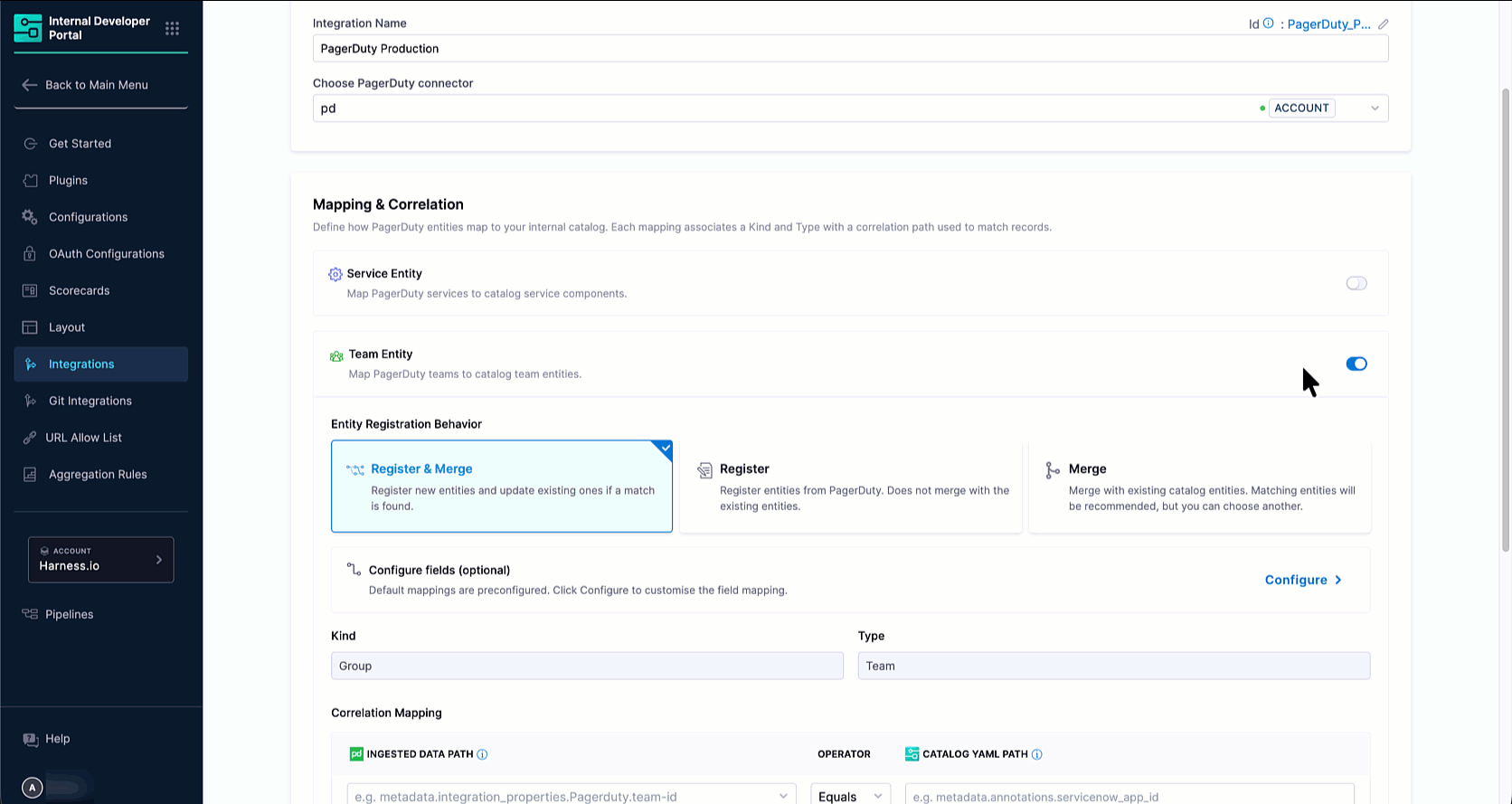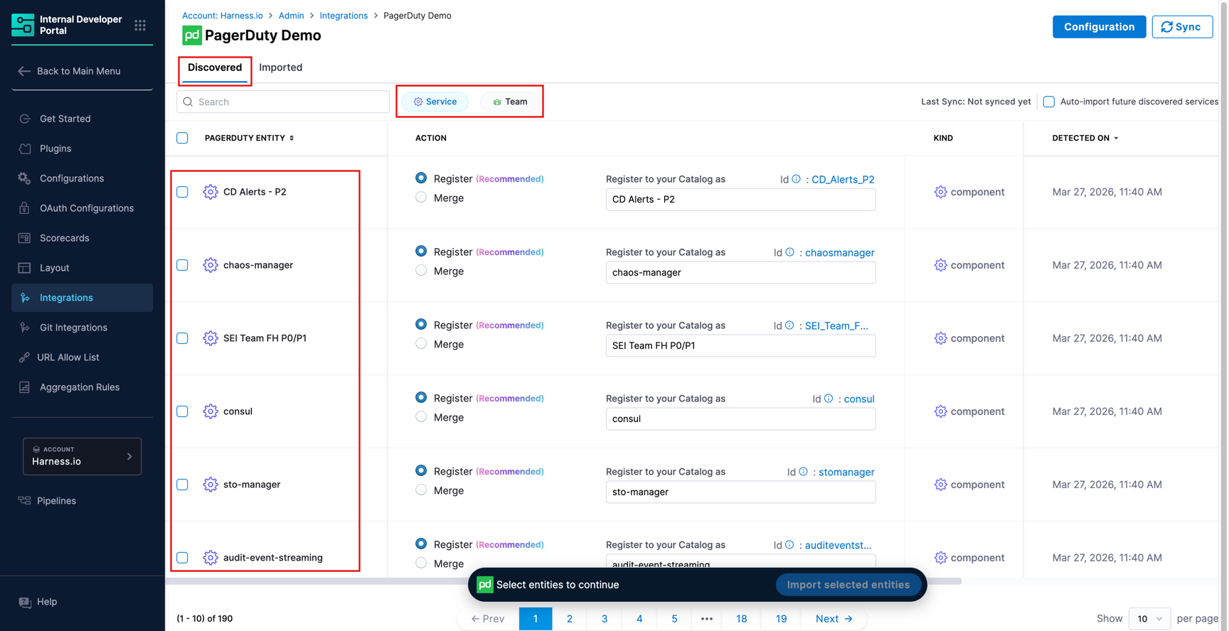 The PagerDuty integration automatically discovers services and teams from your PagerDuty account and brings them into the IDP Catalog. Once discovered, entities can be registered as new catalog entries or merged into existing ones, enriching them with PagerDuty-sourced metadata such as on-call schedules, incident analytics, and team ownership.