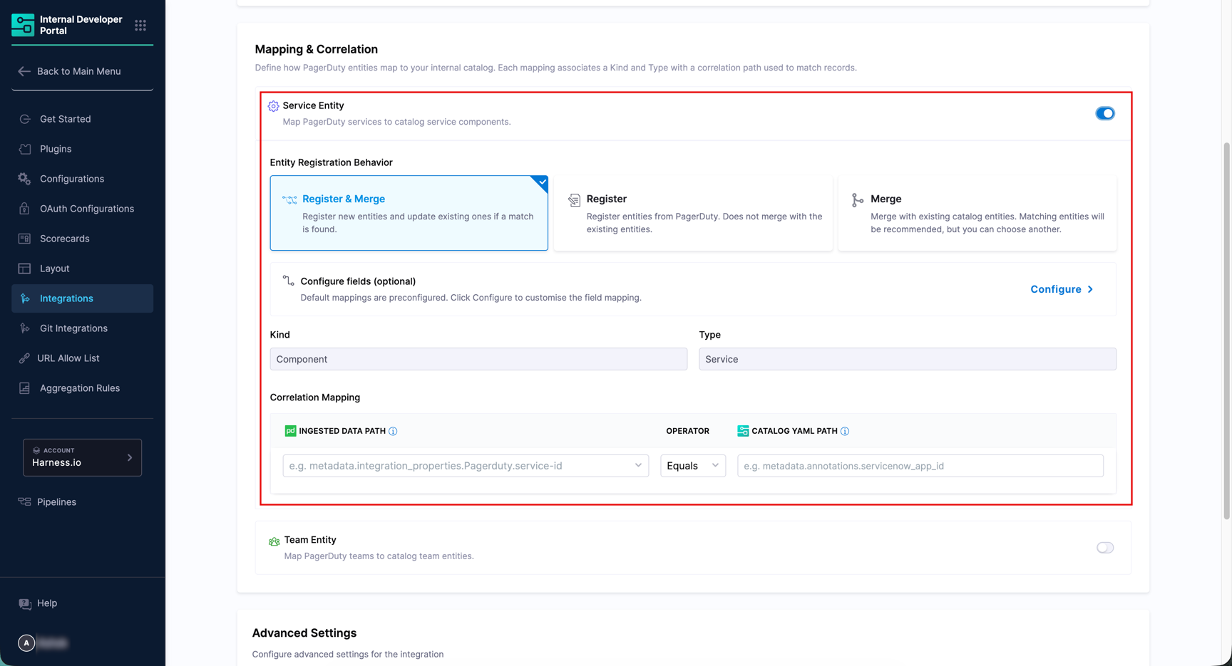 The integration supports two entity types: Service Entity and Team Entity, each with its own toggle, registration behavior, and field configuration.