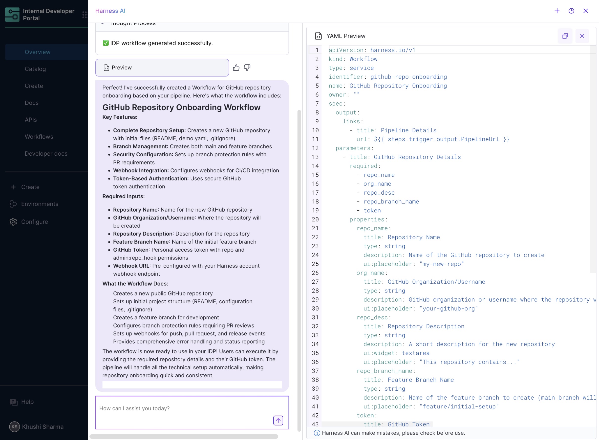 | Workflow Help | "I want to create a new Harness repo. Is there any IDP workflow for that?" | Workflow suggestion + approval workflow trigger |