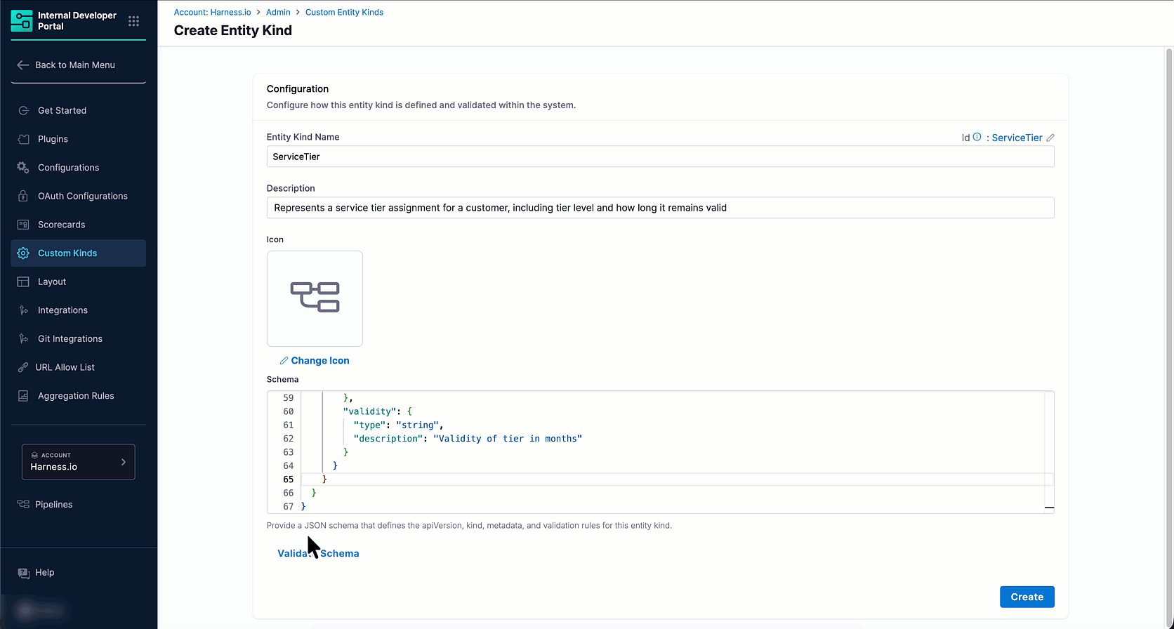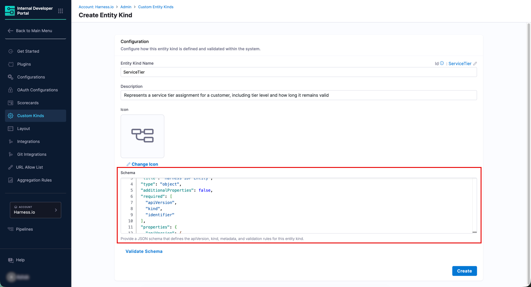 CustomerProfile,MLModel,ETLJob). This value becomes thekindfield in catalog YAML.infoIf required, you can change the kind name after creation, but not its identifier.