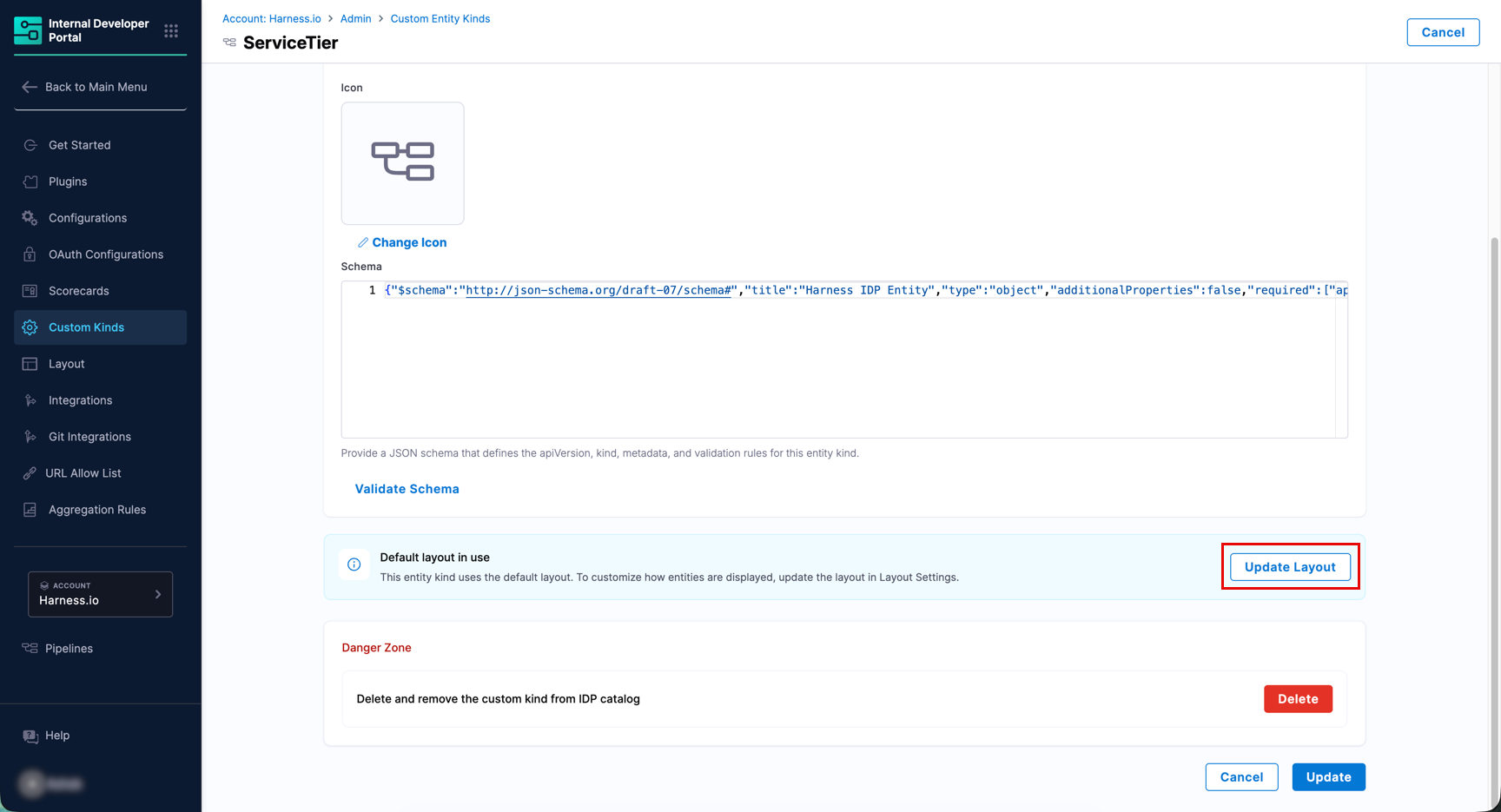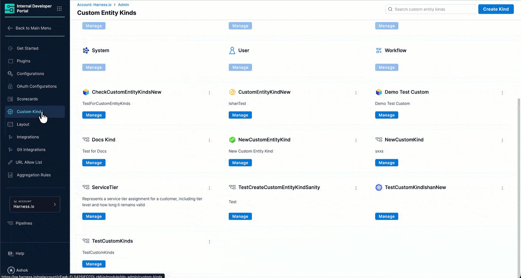 To manage an existing custom kind, go to Custom Kinds, find the kind in the list, and click Manage. The kind's management page opens showing the icon, schema editor, layout status, and more.