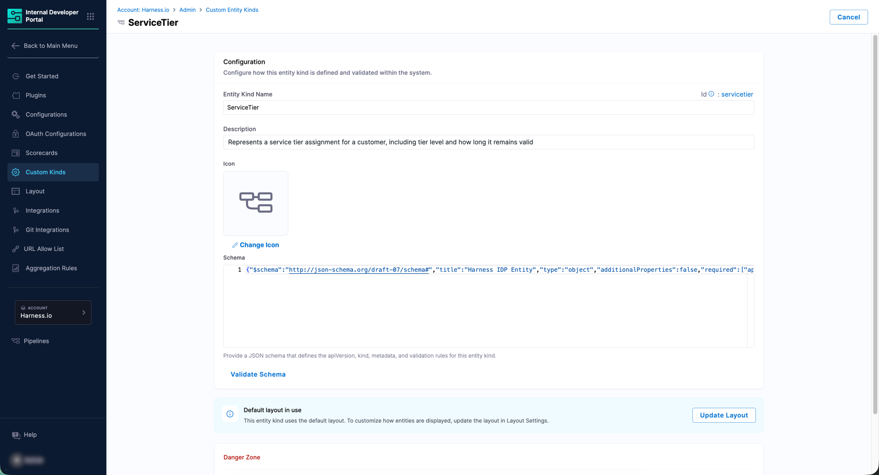By default, entities of a custom kind use the IDP default catalog layout. The Default layout in use notice on the Manage page shows this status.