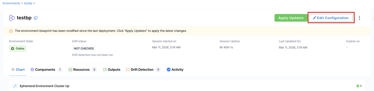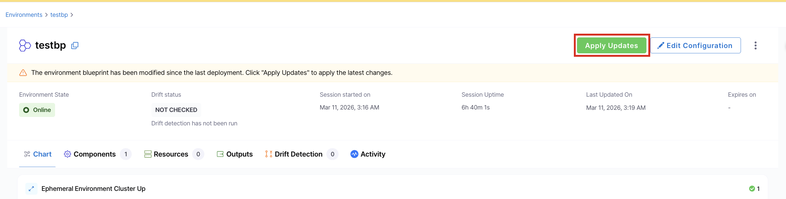 Apply Updates evaluates the differences between the current environment state and the latest blueprint, then only updates the components or resources that have changed. Unchanged entities are left alone. Note that some changes may require updating underlying infrastructure, which could lead to temporary environment downtime.