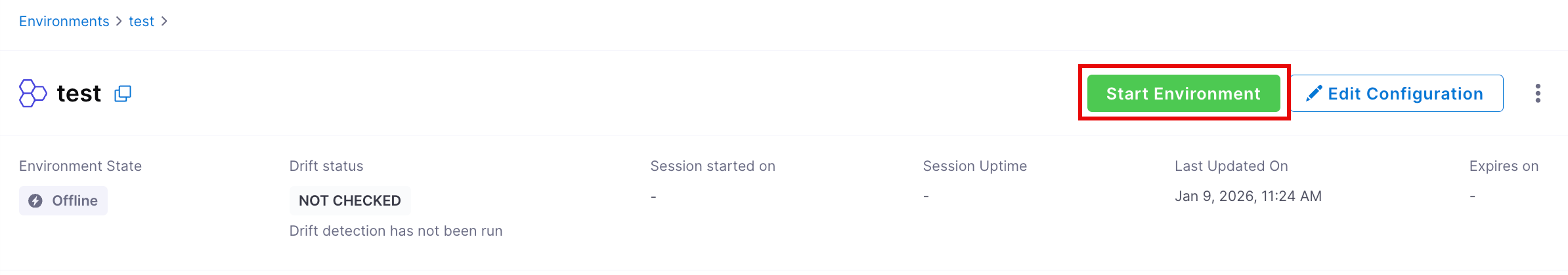 Go to your environment, and from the kebab menu (:) at the top right, click Start Environment. When starting an environment, the system fetches the latest blueprint for the configured version and provisions accordingly. If the blueprint has been updated since the environment was last running, those changes are applied automatically.