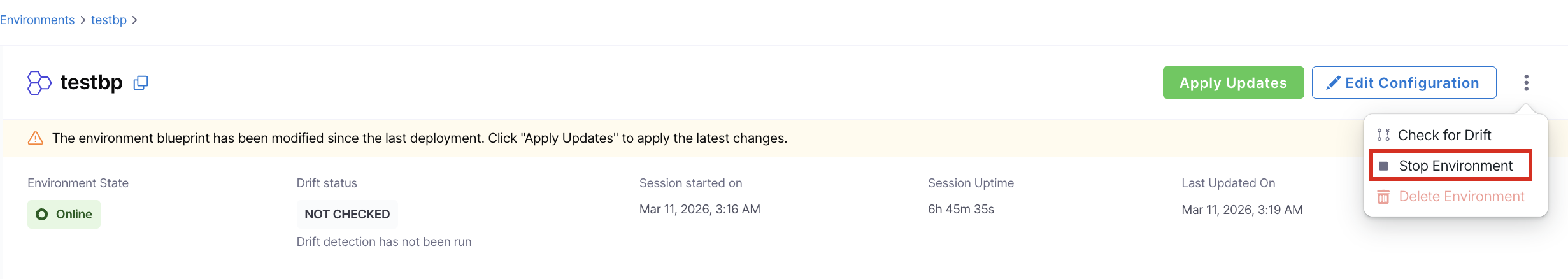 When updates are available for a running environment, a banner appears on the environment detail page prompting you to apply them. There are two scenarios which will trigger this banner: