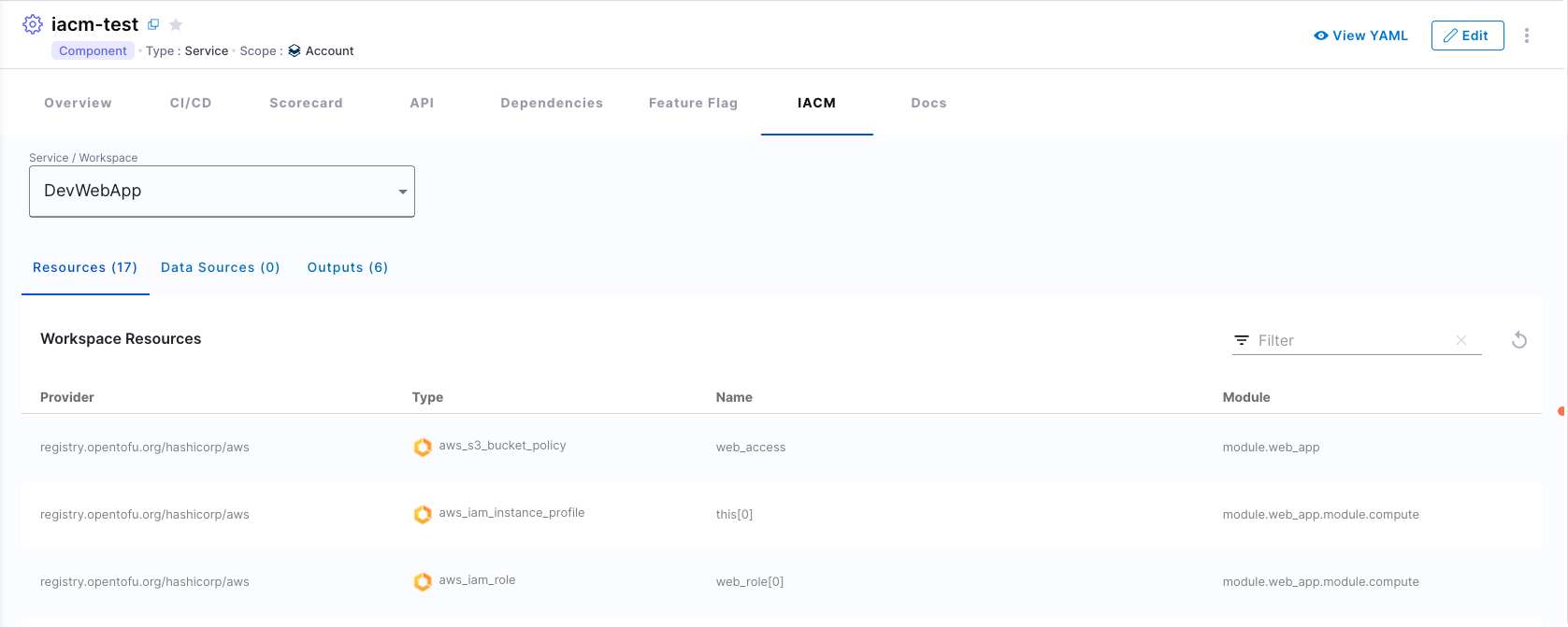 To configure the plugin for a service in the software catalog, set one or both of the following annotations in its catalog-info.yaml definition file, you can fetch the workspaces URL from the workspaces page. Note that the URL should be in the format of https://app.harness.io/ng/account/<ACCOUNT_ID>/module/iacm/orgs/<ORGANIZATION_ID/projects/<PROJECT_ID/workspaces/<WORKSPACE_ID/resources