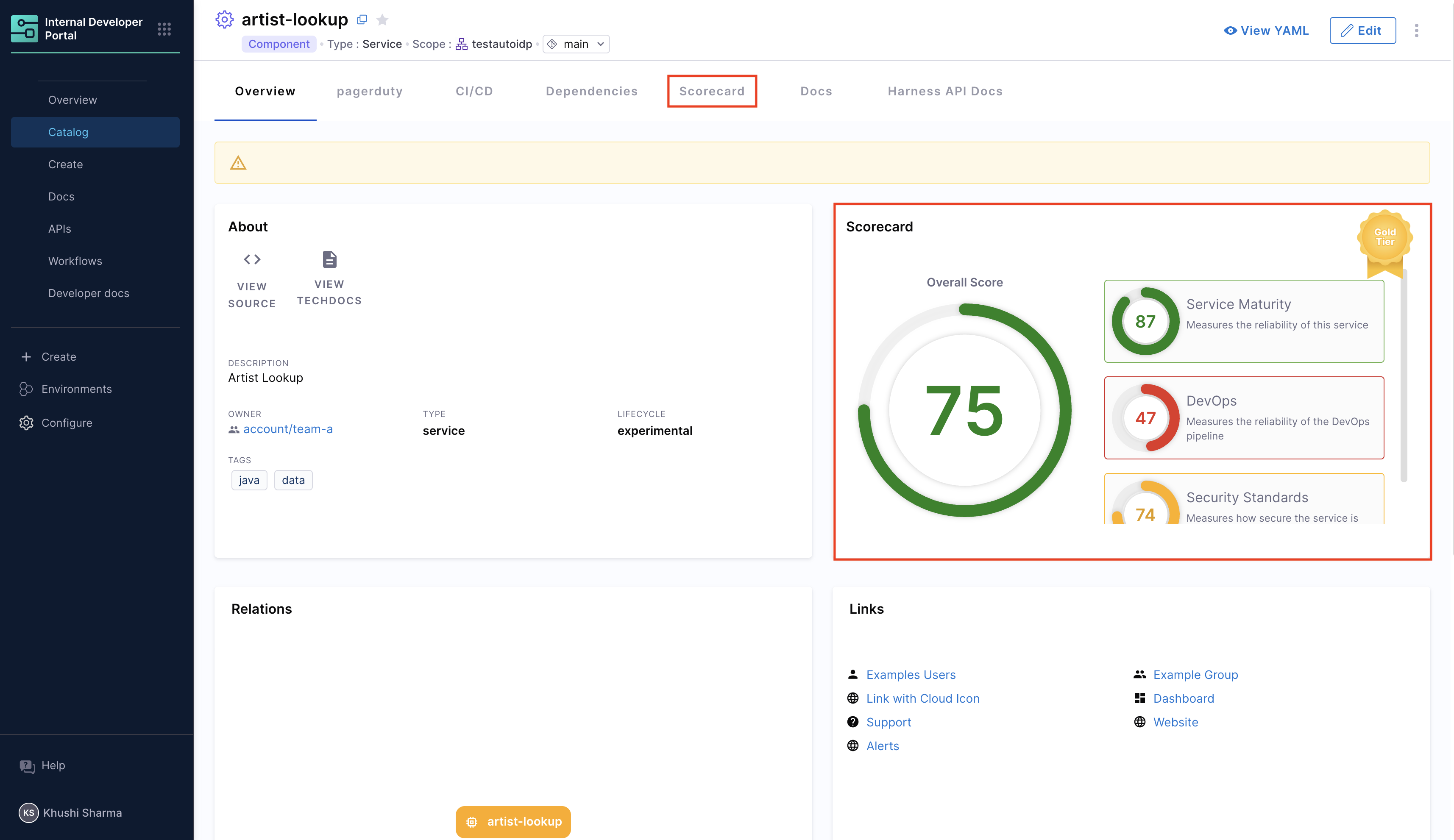 Scorecards have two main UI components that are developer-facing and displayed in the Catalog: