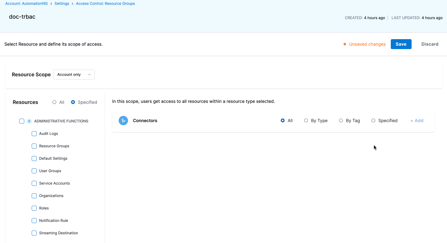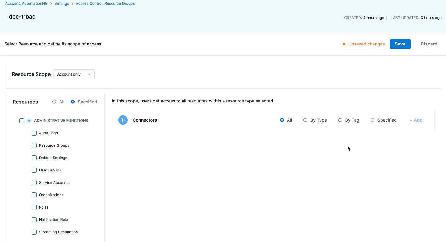 Specified: Grants access to one or more specific connectors that have already been created. This option is available only at Account-only, Organization-only, or Project-only scopes.