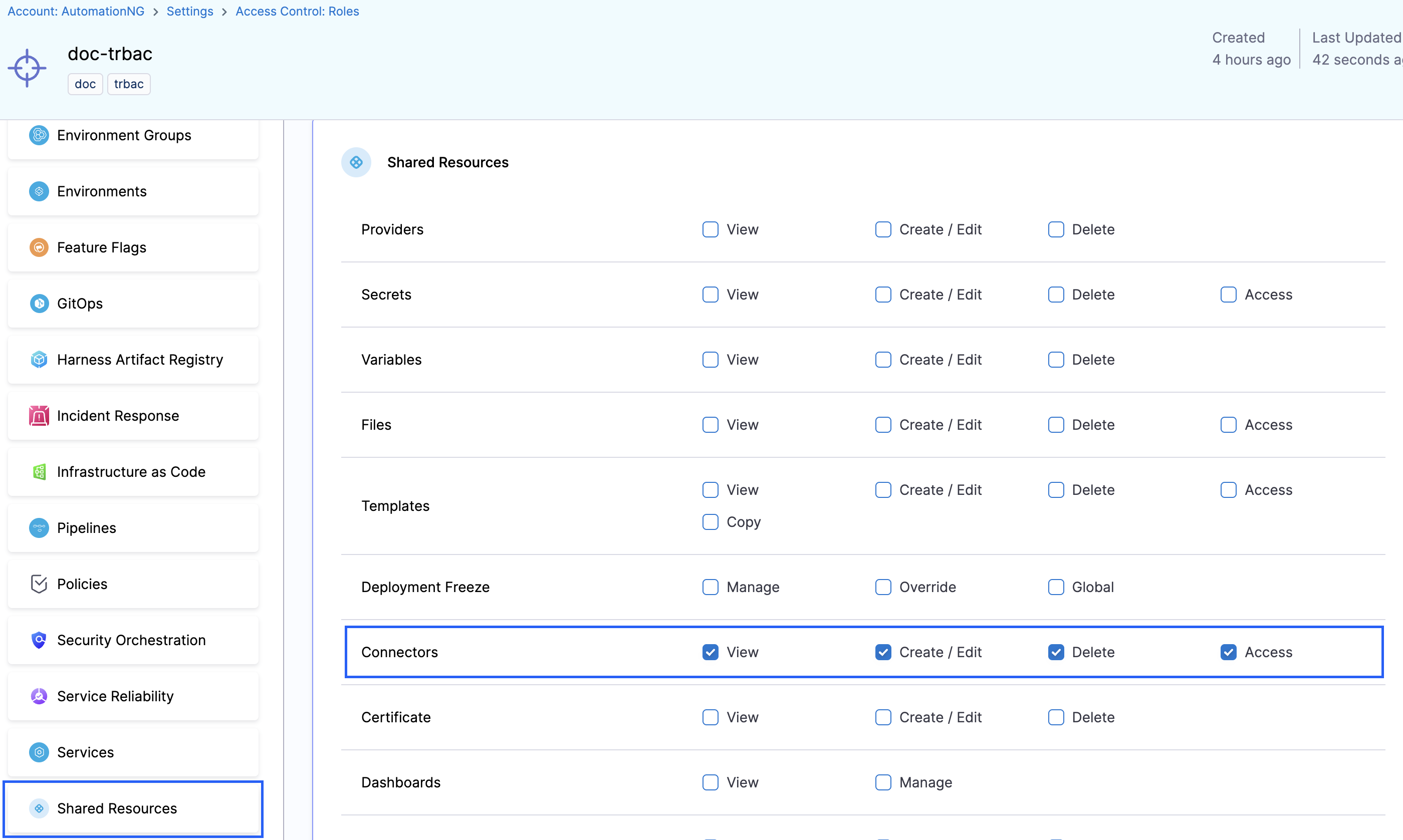 Add or edit a role, check for Shared Resources → Connectors section to ensure the appropriate permissions are granted, as shown in the image below.