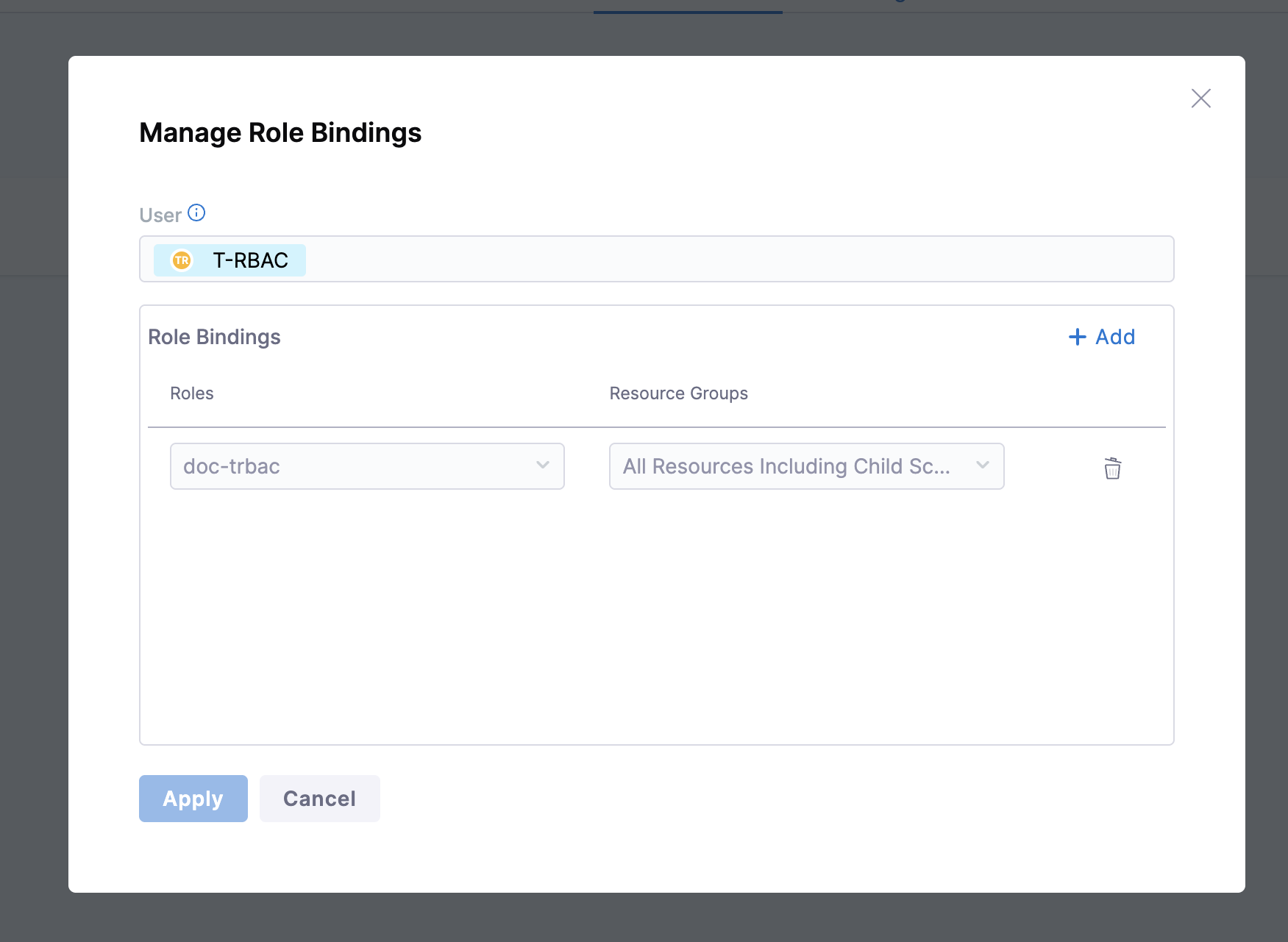 For example, to assign access to a user, navigate to Account Settings → Access Control → Users. For the relevant user, click on Manage Role Binding, and then select the Role and Resource Group created above.