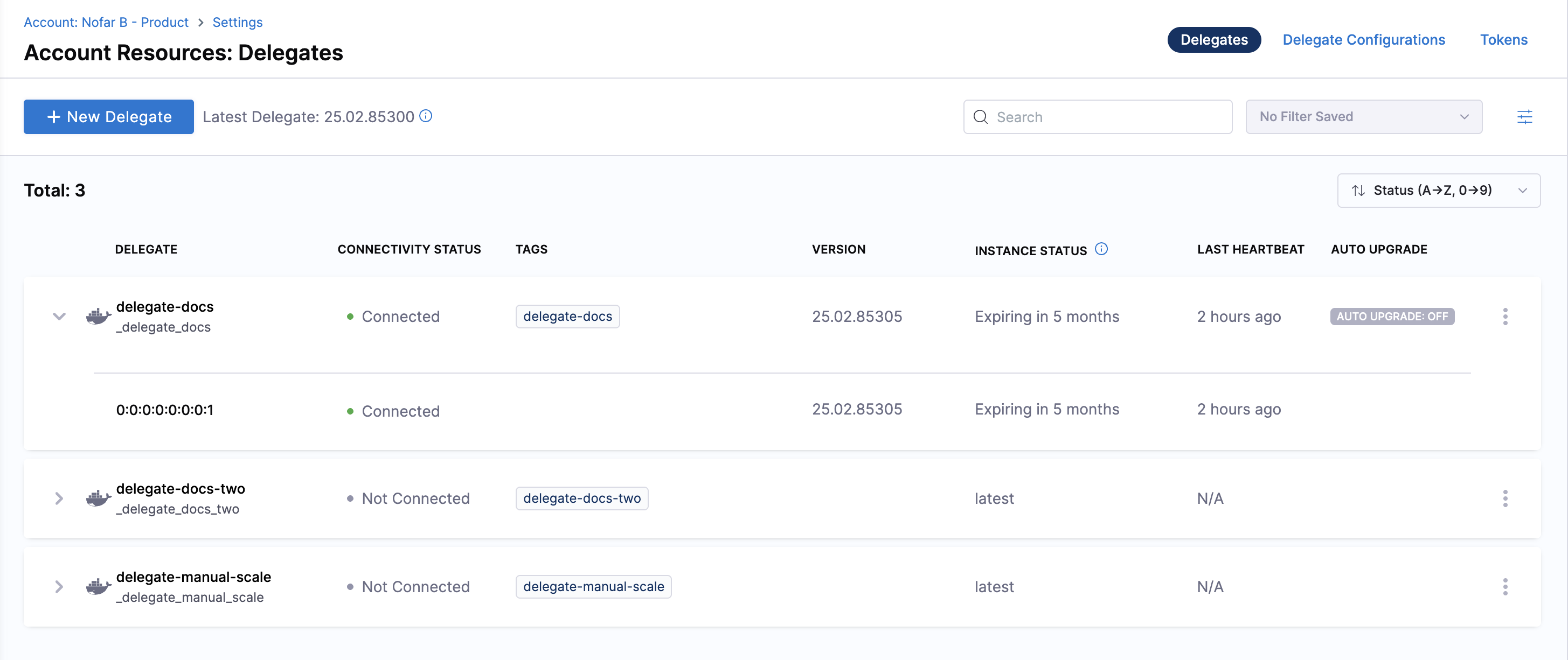 To confirm the delegate is created and running, check its status in the Harness UI on Delegate page as shown in image below.