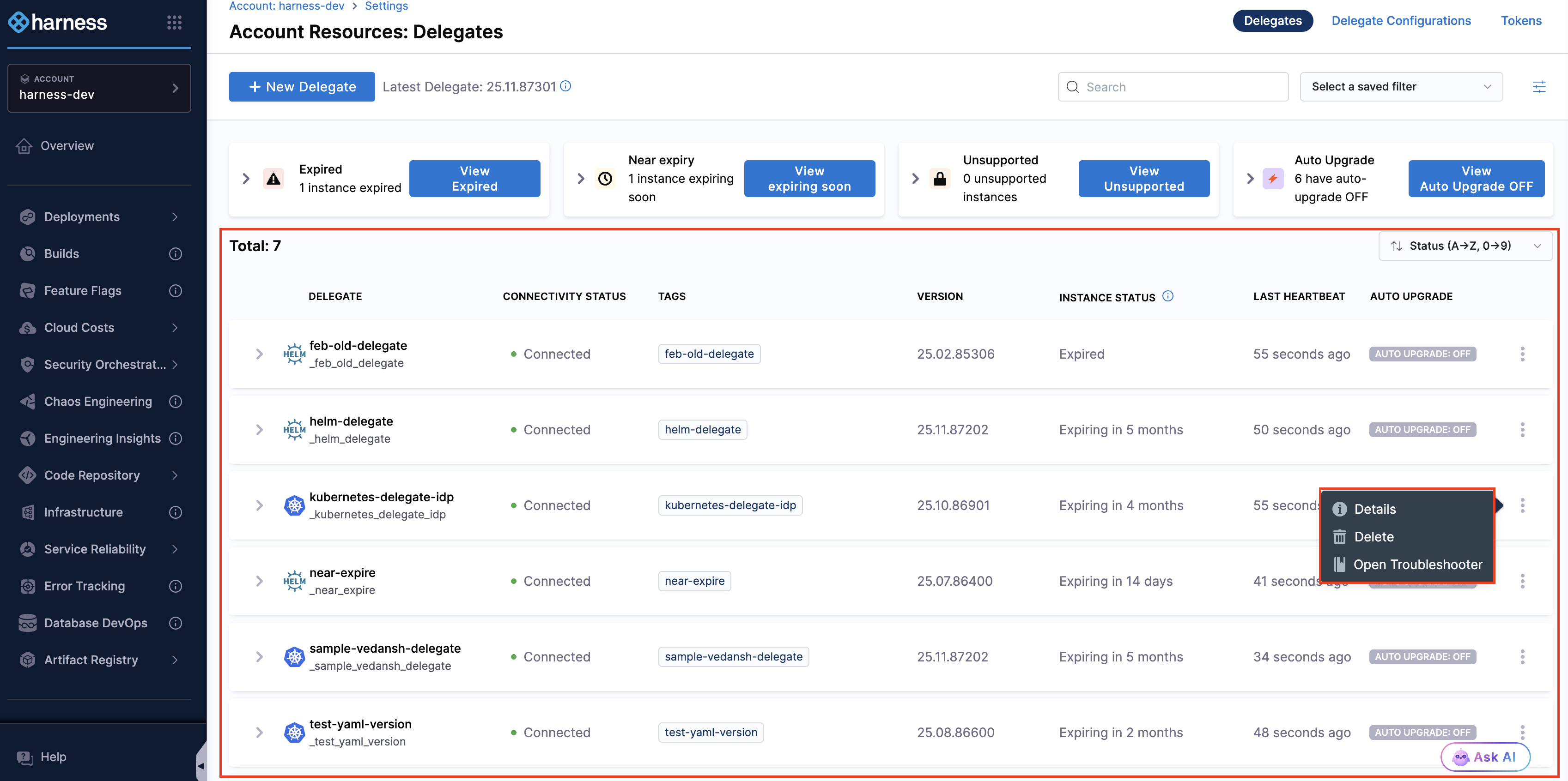 You can manage your delegate instances in your Harness account via the Delegate overview page. To access the Delegate overview page, navigate to your desired scope—Account, Organization, or Project—in your Harness account, and choose Settings > Delegates.