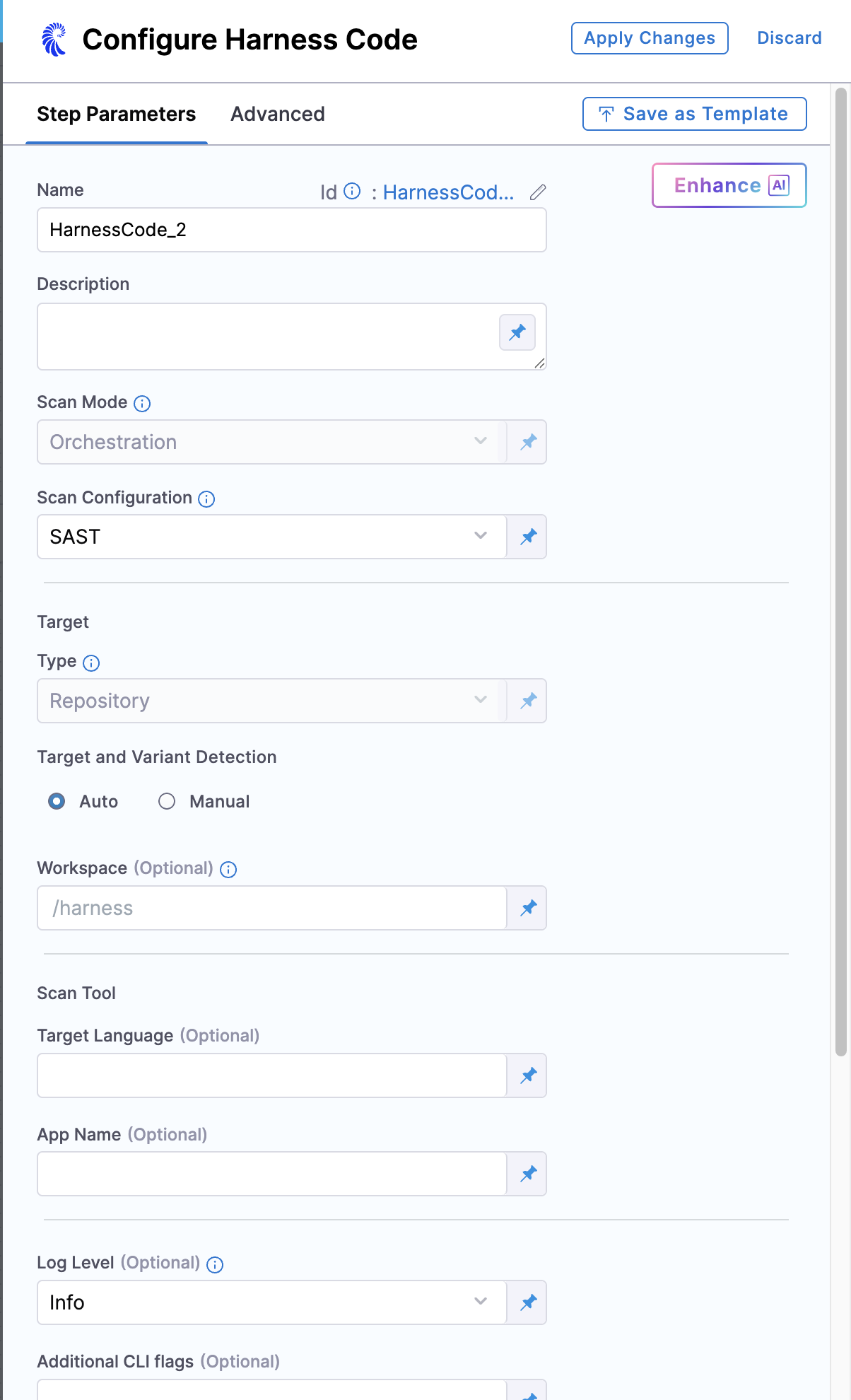 Setting up the Harness Code scanner is the same as configuring any other built-in scanner step. The required configuration is handled automatically, making the setup process simple and straightforward. Here’s how to set it up: