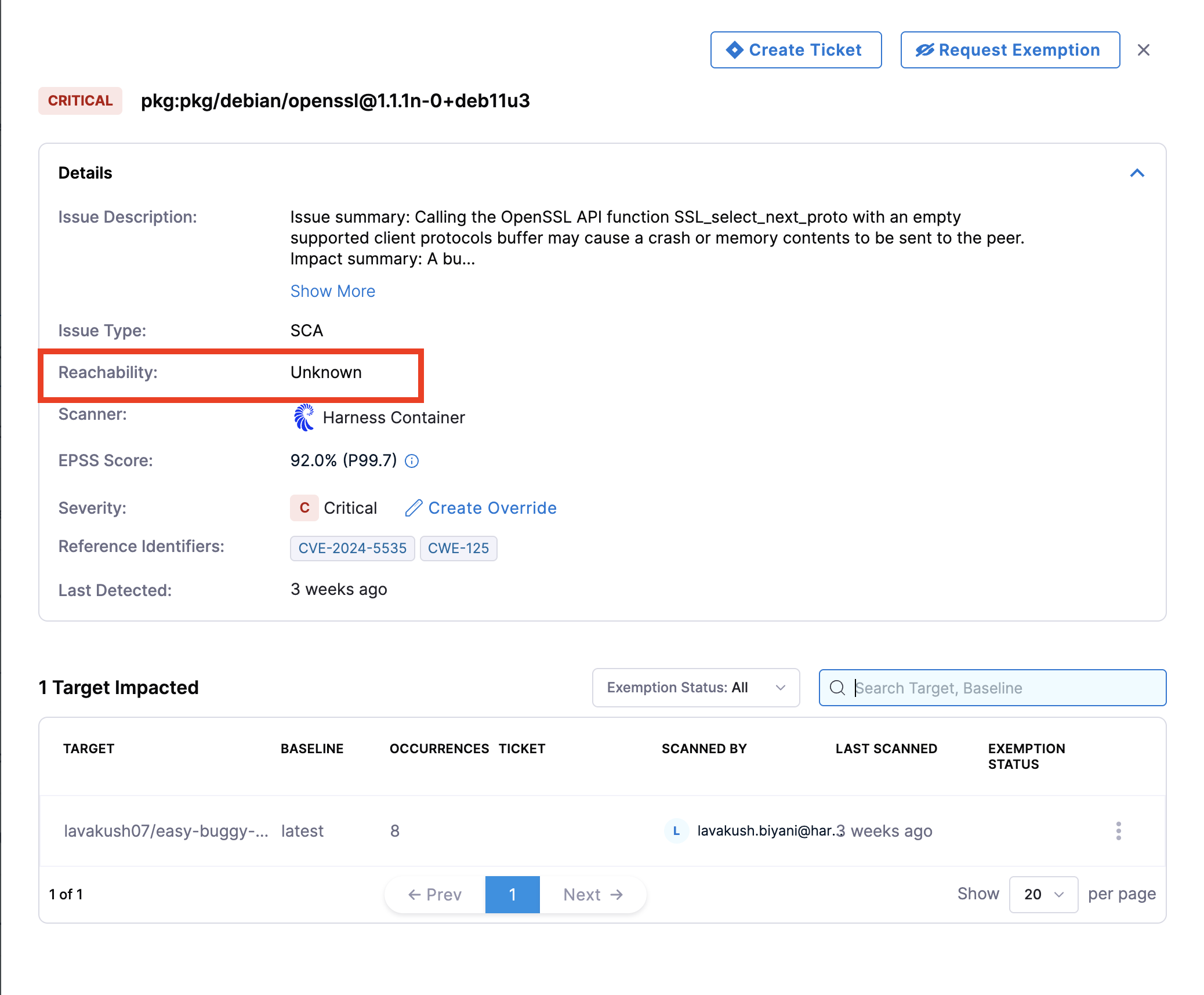 To view Reachability information in Harness Container, you must run the Harness Code scanner. The scanner uses SAST based data flow analysis to understand how data moves through your code and determine whether an issue is reachable.