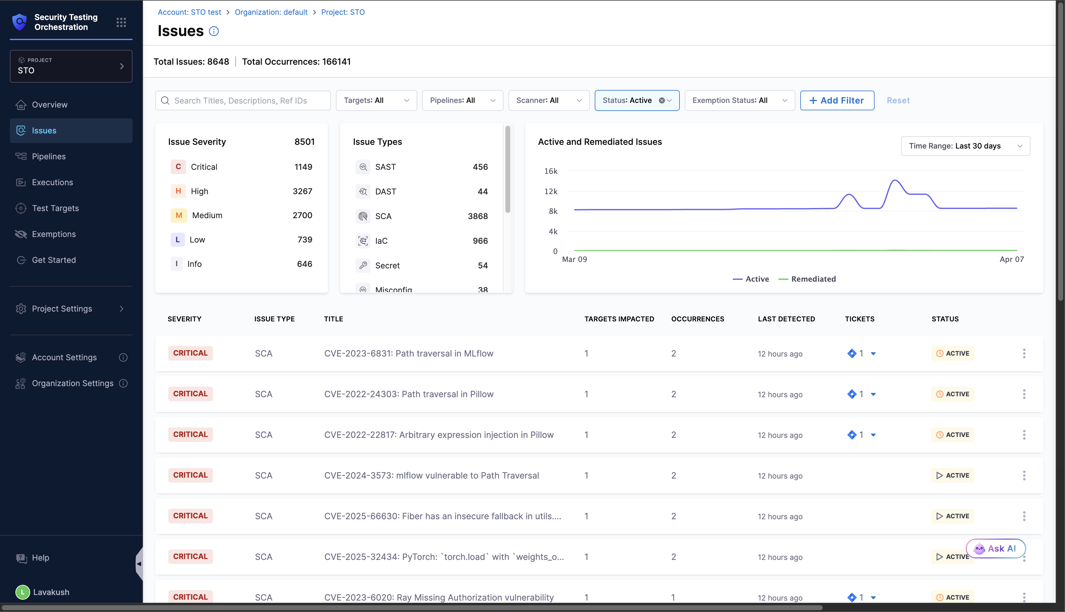 The Issues section at the Project level provides a consolidated view of all security issues affecting your baseline targets, providing a comprehensive list of issues identified across scans in the selected Project. Issues section is currently available only at the Project level. Support for Organization and Account levels will be available soon. From the Issues section, you can: