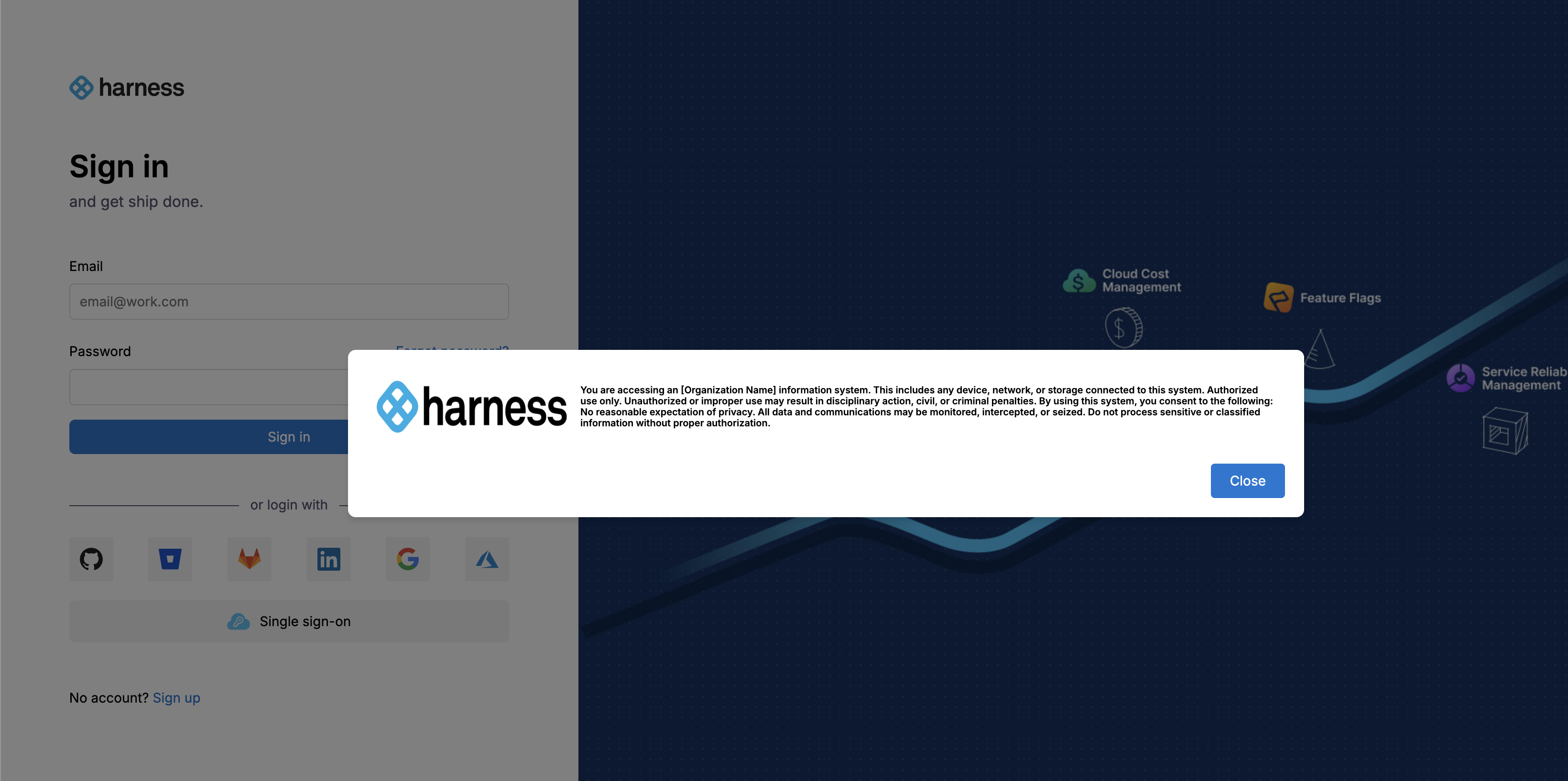 Custom login prompt allows organizations to display security, legal, or compliance notices—such as U.S. Government consent banners— ensuring users see and acknowledge important information before accessing the platform.