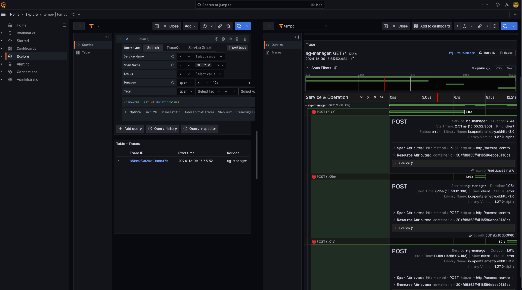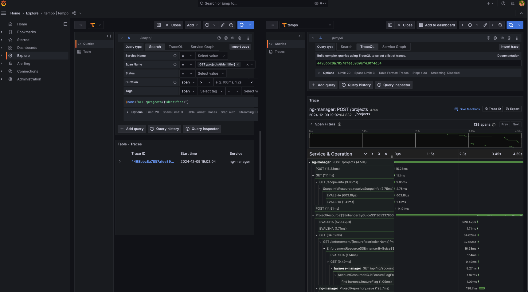 Once traces flow from Harness services through the OTel Collector and are stored in Tempo, you can use the Traces tab in Grafana to: