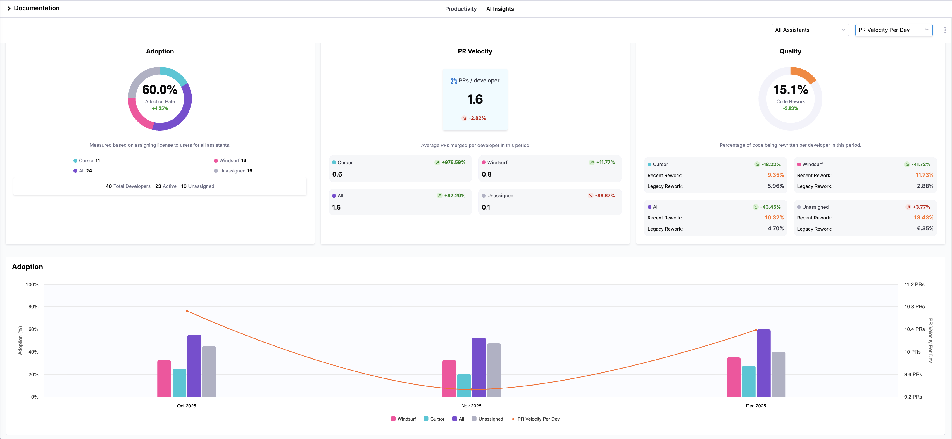 Use the All Assistants dropdown menu to control which assistant's data is calculated across all widgets. Available options include Cursor, Windsurf, and All Assistants. Click the Compare to dropdown menu to overlay a second Y-axis across AI Insight visualizations. This lets you compare AI adoption and performance metrics against a Productivity metric (either PR Velocity Per Developer or PR Cycle Time). Trendlines for Code Rework are also added to each chart so you can assess whether the selected productivity metric is improving, regressing, or remaining stable over the selected time range.