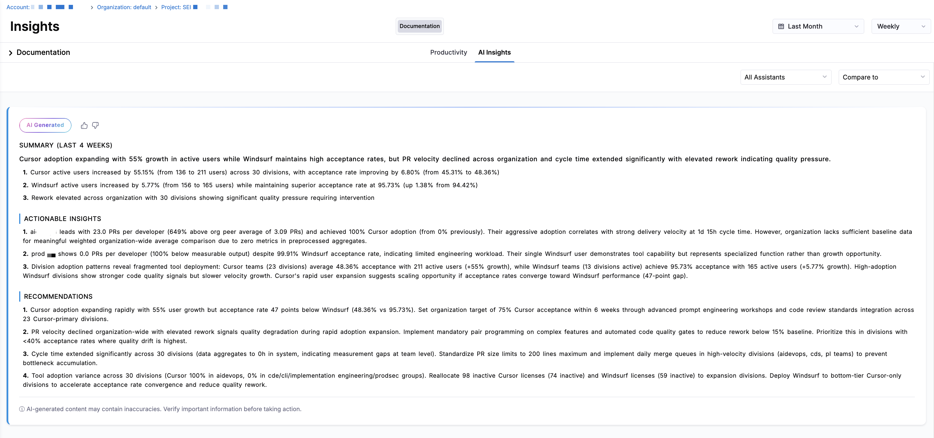 - Recommendations: Guidance on how to improve adoption, PR velocity, PR cycle time, and code quality based on observed signals.