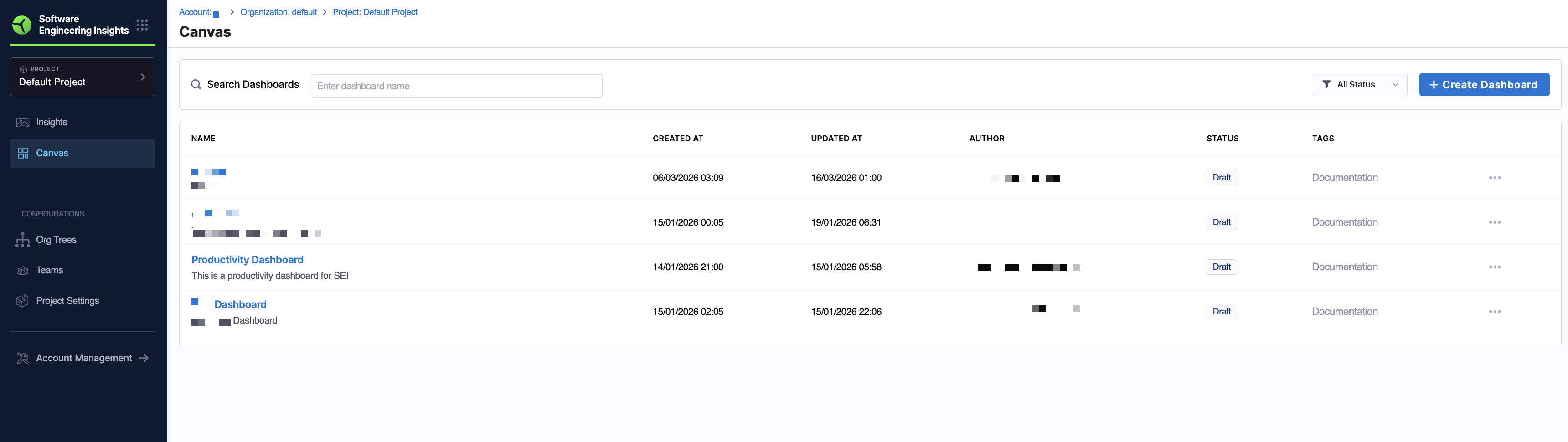 The Canvas page in SEI 2.0 displays all custom dashboards created by your team. You can search, view, and manage dashboards, including details such as the name, description, author, status, timestamps, and tags.